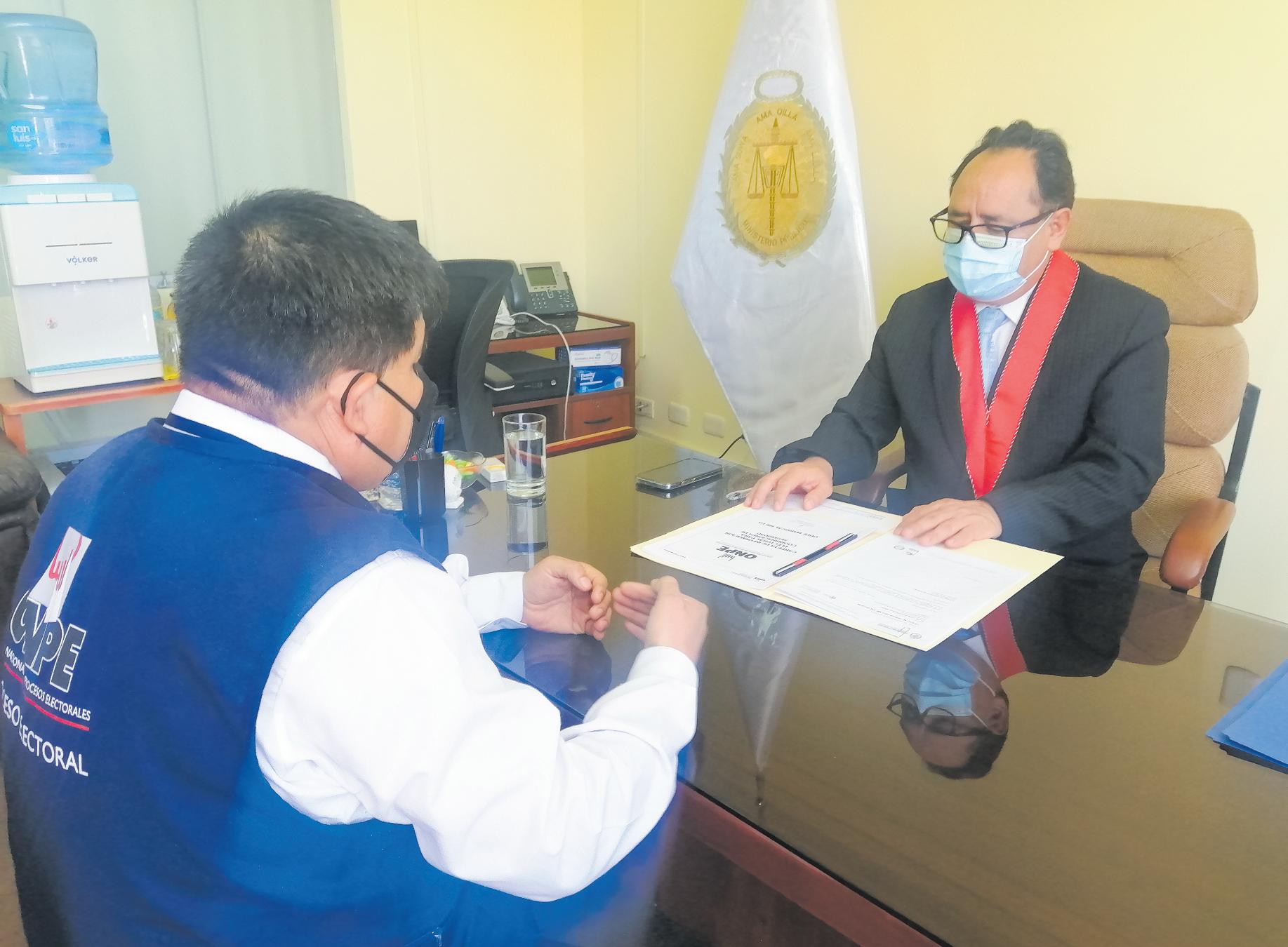 El presidente de la Junta de Fiscales Superiores de Moquegua, Juan José Machicao Tejada,recibiólavisitadeljefe de la ODPE Mariscal Nieto,José Taboada Alama, durante la cita dieron a conocer respecto a la labor que se cumplirá en la jornada electoral del próximo02deoctubre.