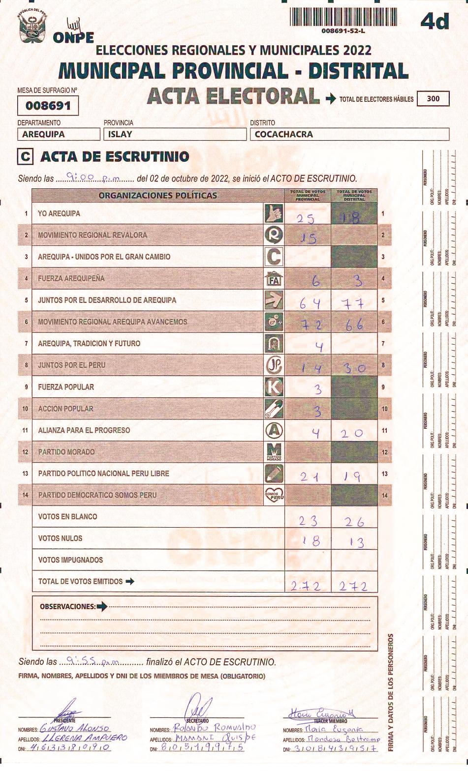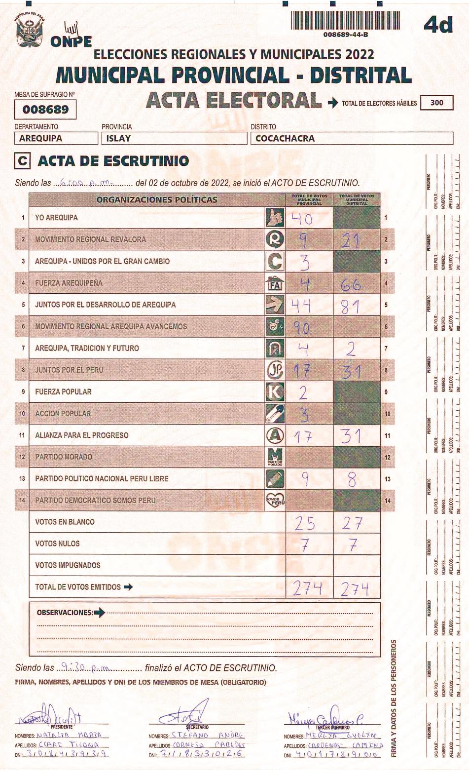 Al final,ganó una mujer,Flérida Meza del partido Podemos Perú,quefuequienaccedióyaqueelcandidatoprimigenioalaalcaldía provincial fue Juan José Casilla Maldonado, con cariño “JJ”,quien murió en plena campaña electoral.Ahora se cree que su triunfo se debió al sentimiento de solidaridad con el partido eidentificaciónconeldifunto,quienestandoenvidacomopostulanteibaenplandeganador.