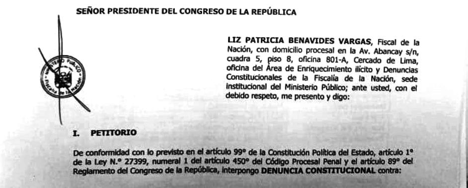 crito ingresado la tarde del martes a la mesa de partes delCongresodelaRepública. A través de la cuenta de Twitter del Ministerio Público, se informó que la denuncia constitucional es por los pre-