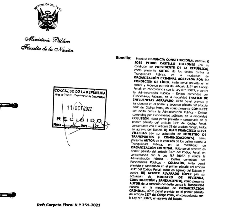 “Formulo denuncia constitucional contra José Pedro Castillo Terrones en su condicióndepresidentedelaRepública como presunto autor de los delitos contra la tranquilidad pública en la modalidad deorganizacióncriminalagravada”,consigna el documento ingresadoalParlamento.