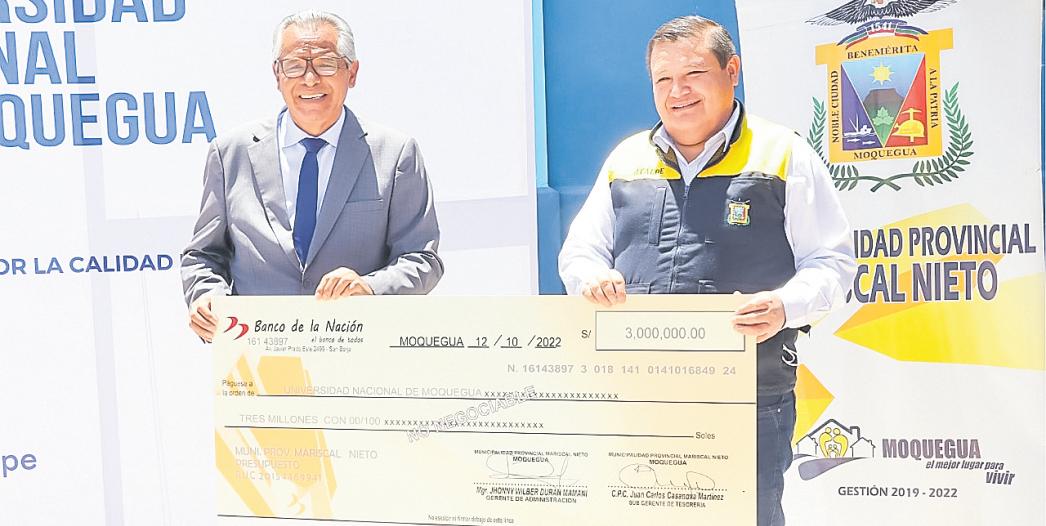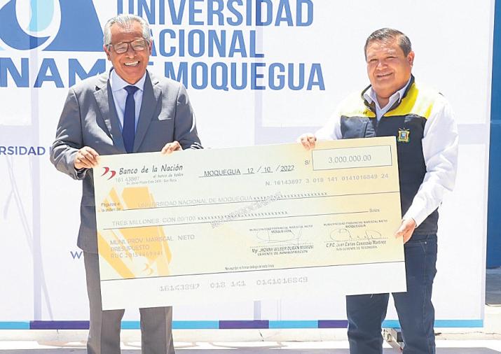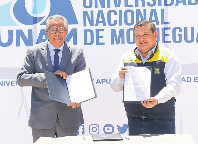 El alcalde provincial de Mariscal Nieto, Abraham Cárdenas Romero y el presidente de la Comisión Organizadora de la Universidad Nacional de Moquegua (UNAM),Washington Zeballos Gámez, suscribieron un Convenio de Cooperación Interinstitucional, con la cual se oficializa la transferencia de 3 millones de soles para la construcción de la biblioteca universitaria, en beneficio de los estudiantes de Moquegua.