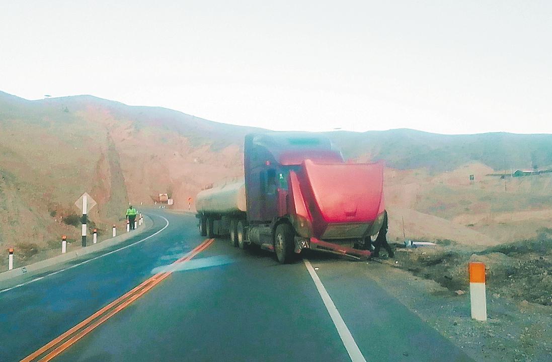 ElvehículohacíalarutaLaPaz(Bolivia)–Iloenel Perú,quedandocruzadoenlacarretera, obstruyendounosdeloscarrilesensentido contrario.