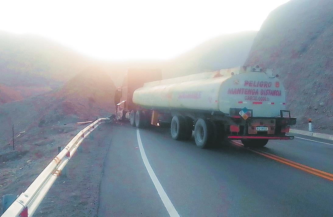 Un tanque cisterna de nacionalidad boliviana sufrió un despiste y se estrelló contra la baranda de seguridad que está junto a la vía, dejando comosaldodañosmateriales El accidente ocurrió en ho-