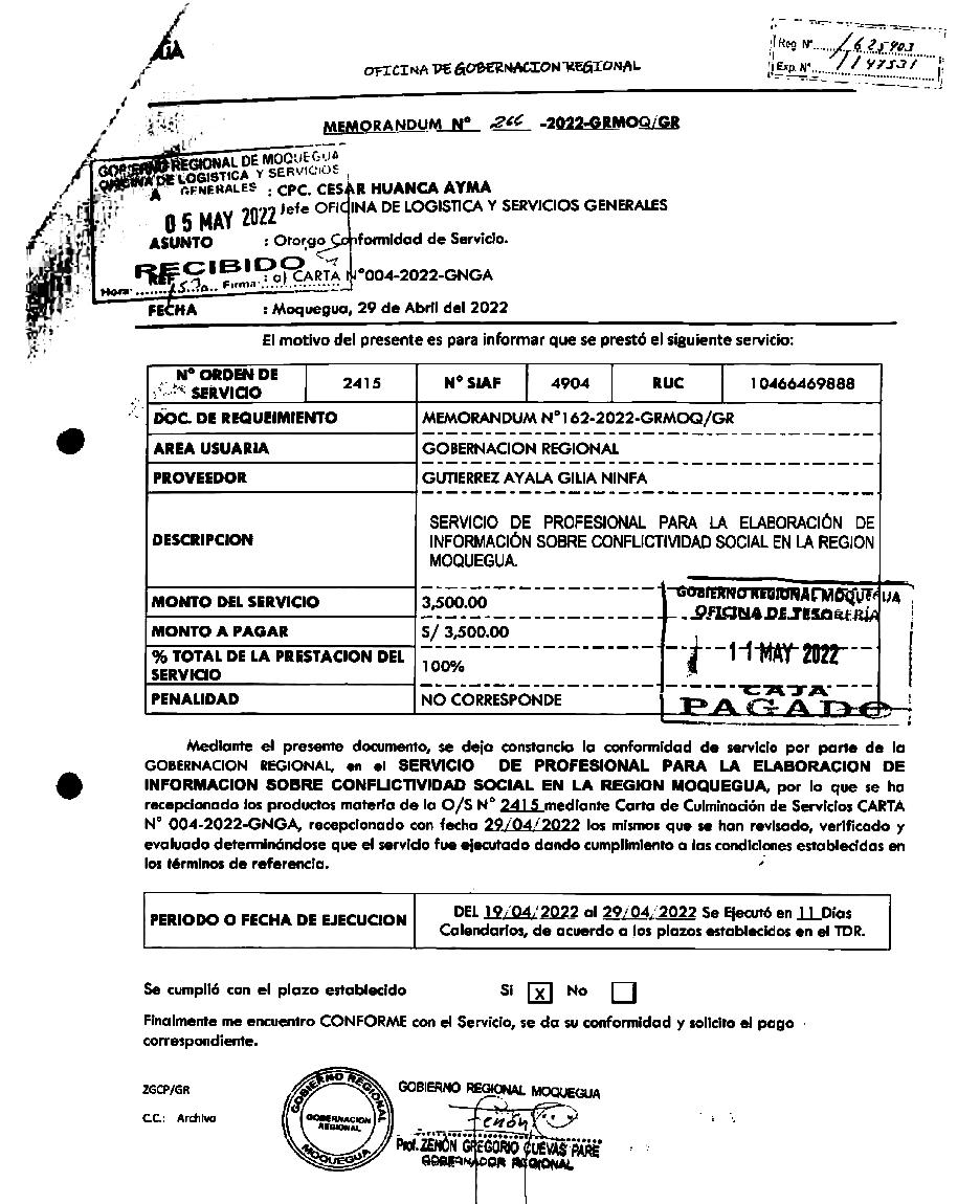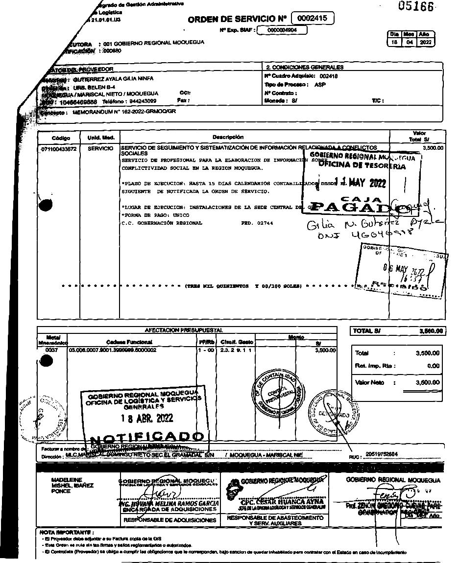 Zenón Cuevas Pare, por 11 días de “trabajo” pagó a Gutiérrez Ayala un monto superior al que le correspondía de acuerdo a la escala aprobada mediante Resolución Ejecutiva RegionalN°1001-2013-GR./MOQ, ¡!ING.ANITA PEÑALOZA VILLANUEVA