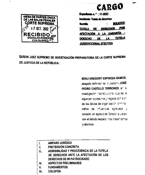 El abogado del presidente Pedro Castillo, Benji Espinoza, presentó este lunes ante la Corte Suprema una tutela de derechos para anular la denuncia constitucional planteada por la fiscal de la Nación, Patricia Benavides, contraelmandatarioanteelCongresodelaRepública.