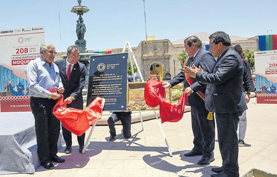 El alcalde provincial de Mariscal Nieto, Abraham Cárdenas Romero, durante la ceremonia de proclamación y entregadelaplacaylaesculturaen relieve por los por los 208 años de la primera proclamacióndeindependenciaenMoquegua, reconoció a personajes como Bernardo Landa Vizcarra, que hace 208 años demostró heroísmo y contribuyó para que por primera vez se dé el grito de la independencia,enlaplazadearmas.