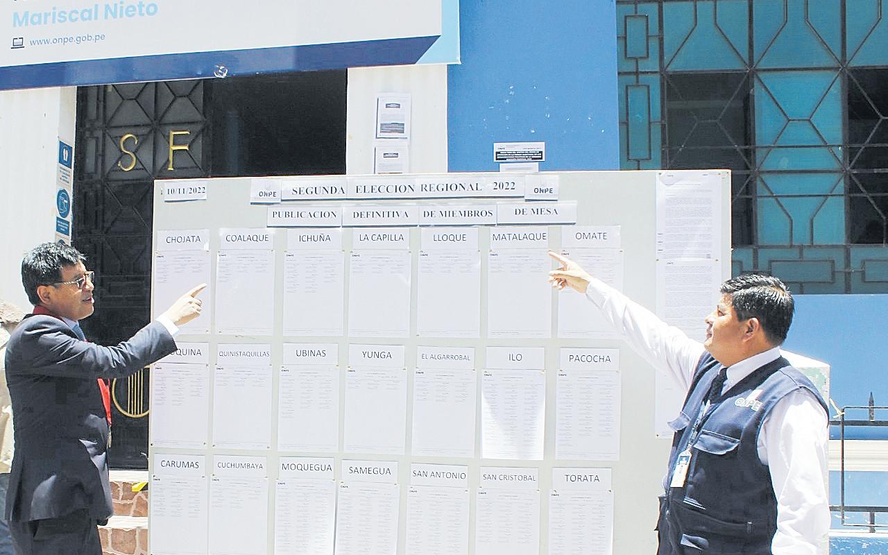 El primer lugar donde se realizó la publicación definitiva de los miembros de mesa fue en el frontis de la ODPE Mariscal Nieto,ubicada en calle Ayacucho Nro. 454. De forma simultánea, los coordinadores distritales y de centros poblados publicaron la relación definitiva en los 21 distritos y 9 centros poblados correspondientes a la mencionadaoficinadescentralizada.