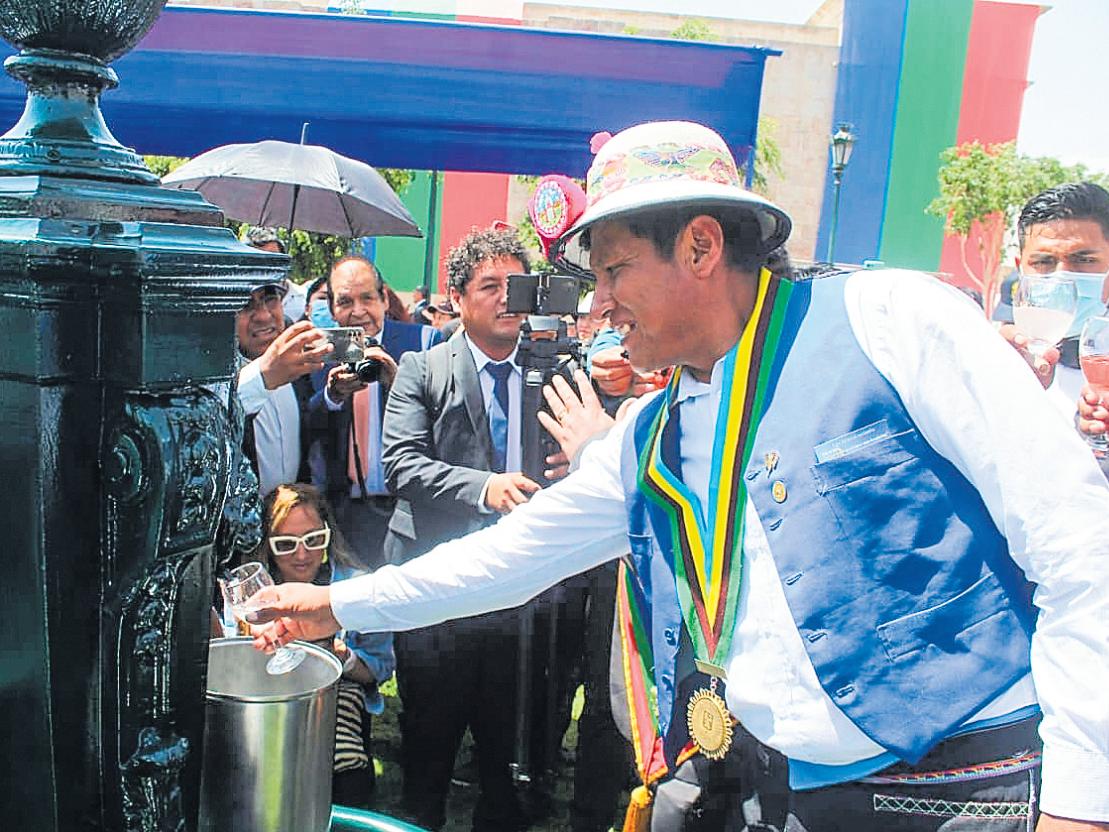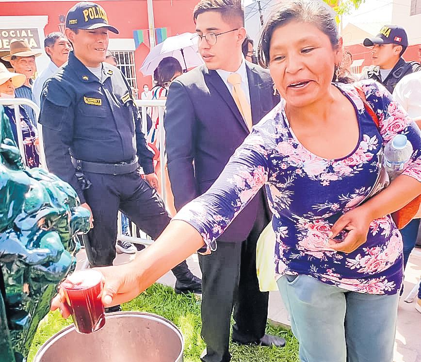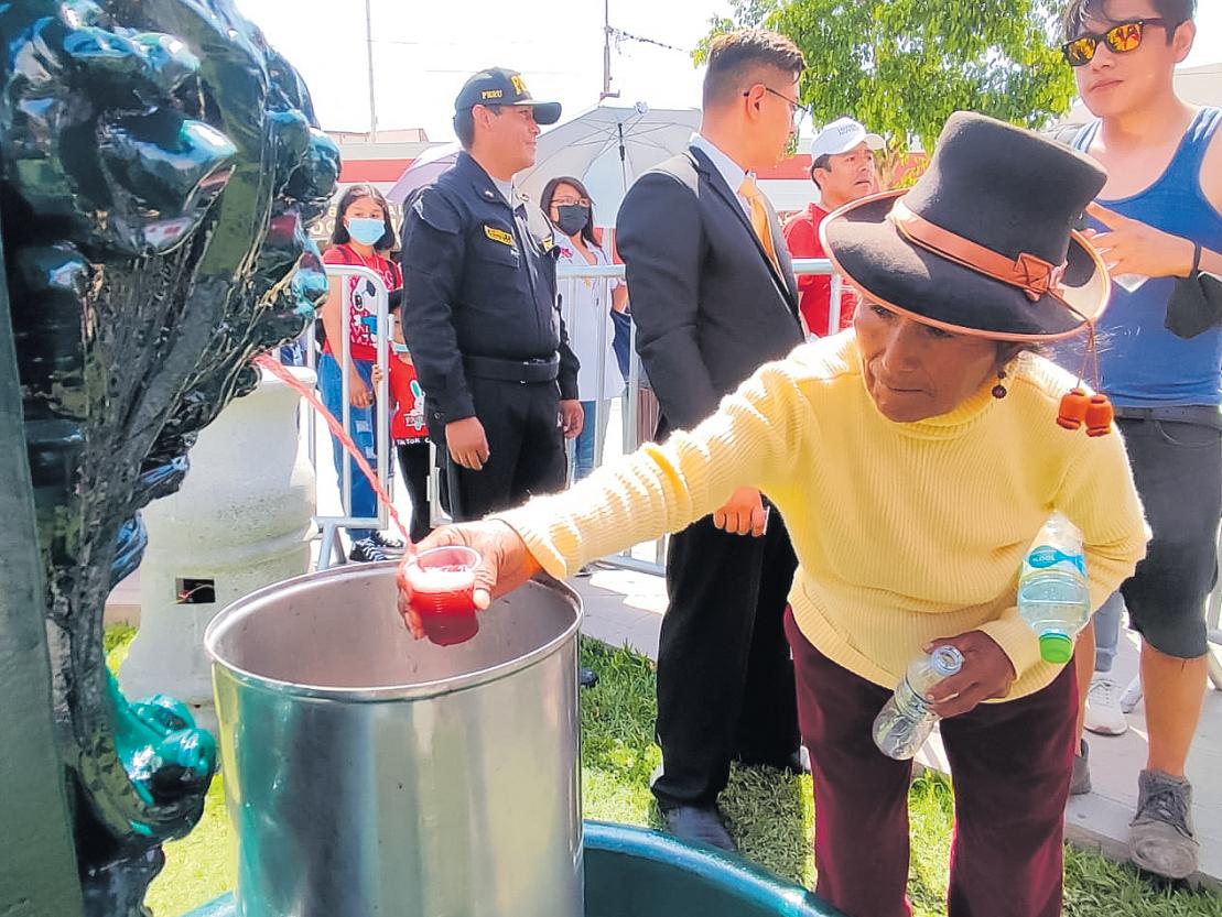 Autoridades invitadas y población realizaron elbrindisconsucopadevinoquevertiódela piletaubicadaalladodecalleAncashypisco delaqueseencuentraporlacalleTacna.