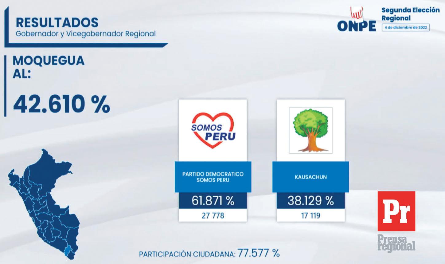 go, la provincia de General Sánchez Cerro,terminaría por dar el triunfo a Somos Perú, de acuerdo con el avance del conteo rápido de las mesas electorales.