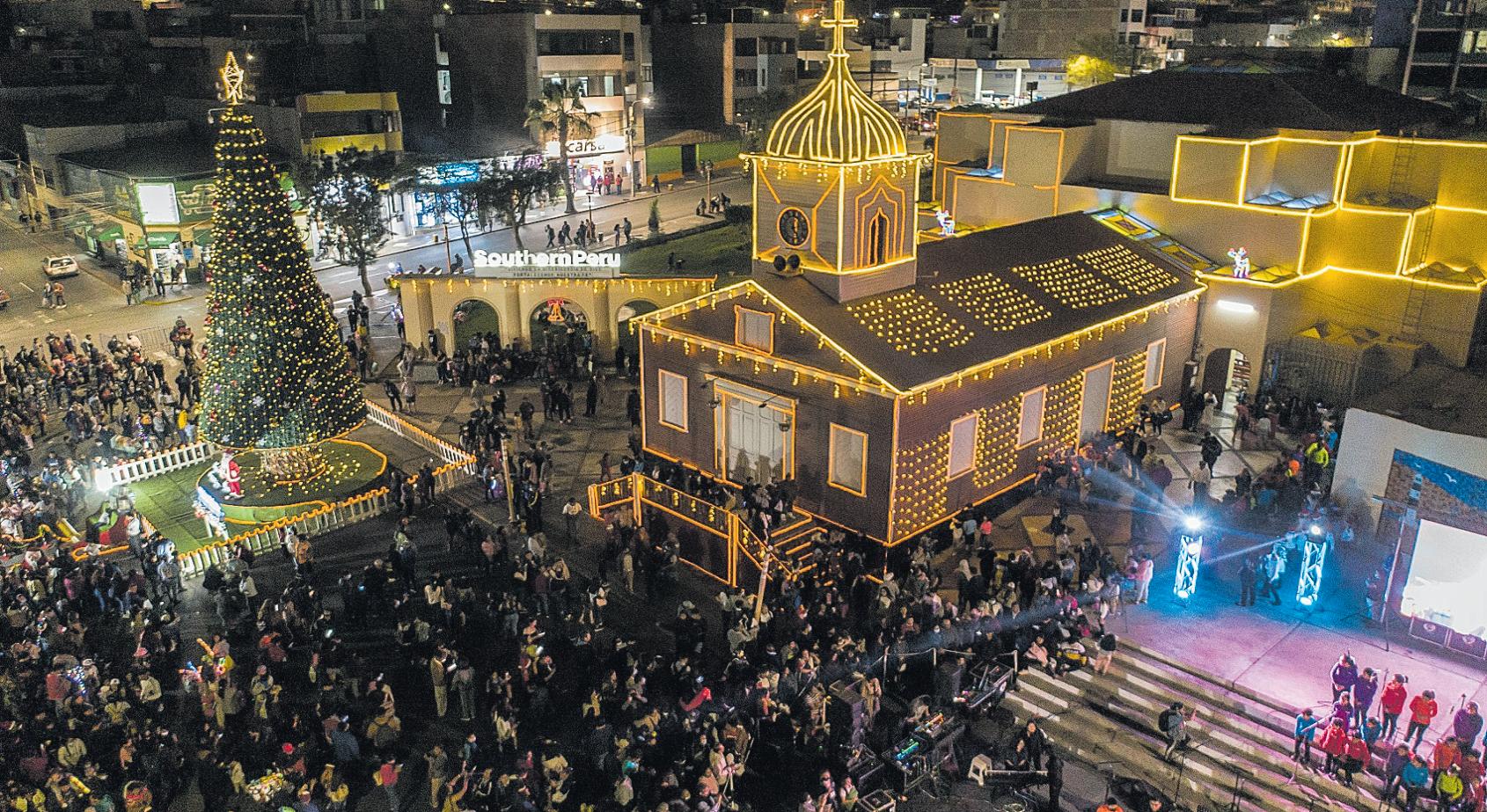 Eltradicionalencendidode luces se inició el último jueves en la iglesia San Jerónimo de Ilo y estuvo a cargo del Director de Operaciones de Southern Perú Ilo, Ing. Manuel Munguía Aguirre,acompañadodelalcaldeprovincialSr.Gerardo Carpio.Continuó el viernes en la Co Catedral Santo Domingo de Moquegua donde se instalaron,hasta 48 metros de altura de luces tipo led