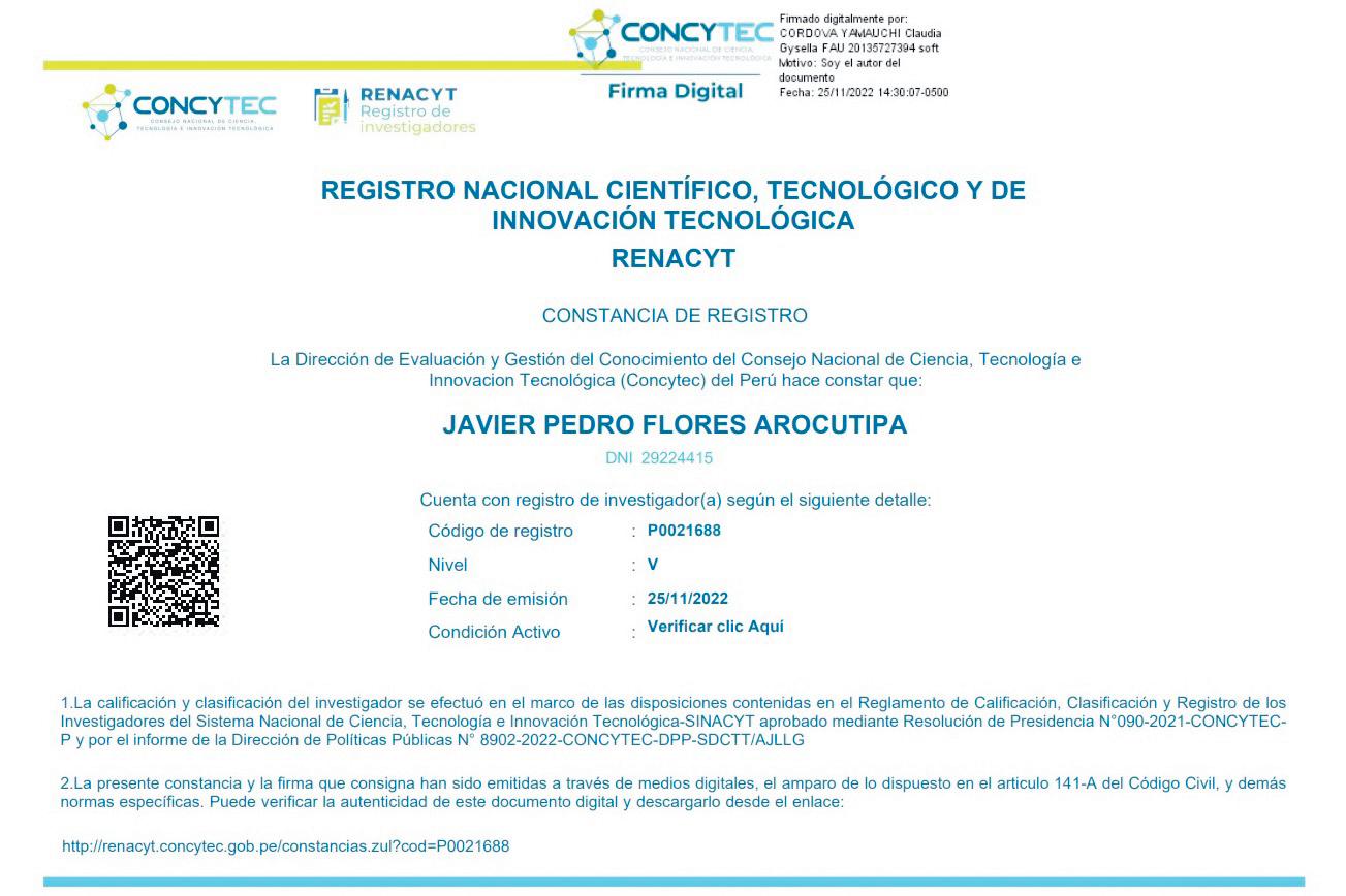 El Consejo Nacional de Ciencia, Tecnología e Innovación Tecnológica,Concytec,elpasado 25 de noviembre del 2022 ratificó que el Dr. Javier Flores Arocutipa es docente Investigador Renacyt (Registro Nacional Científico, Tecnológico y de Innovación Tecnológica)