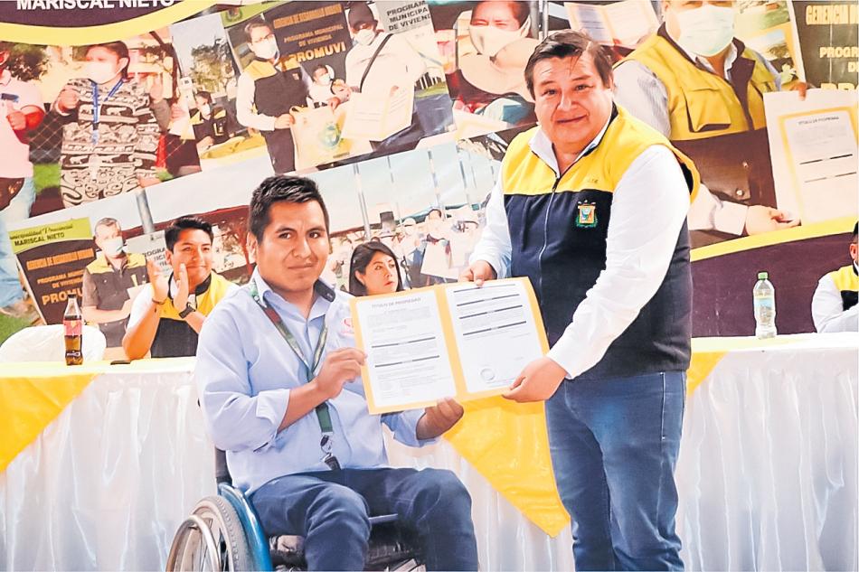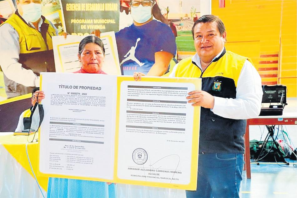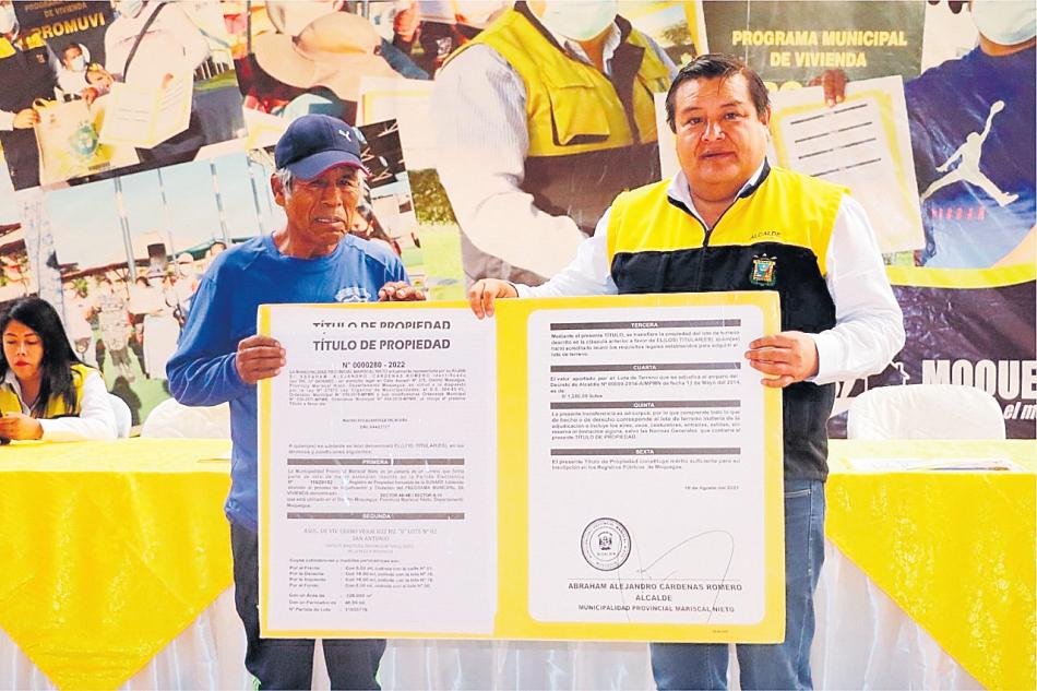 El alcalde provincial de Mariscal Nieto, Abraham Cárdenas Romero, entregó la tarde del jueves 180 títulos de propiedady200certificadosdeposesión a familias asentadas en los centros poblados de Chen Chen y San Francisco y el distrito de San Antonio, quienes hicieron su sueño realidad de formalizar sus predios luego de una larga espera de 20 años.y que les permitirá accederaunaviviendadigna.