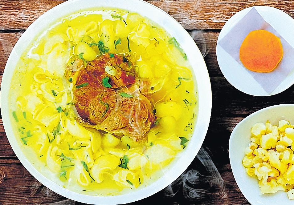 Setratadeuncaldodecarnero, mondongo y mote con hierbabuena. Es una sopa muy reconfortante y sustanciosa.[Promperú]