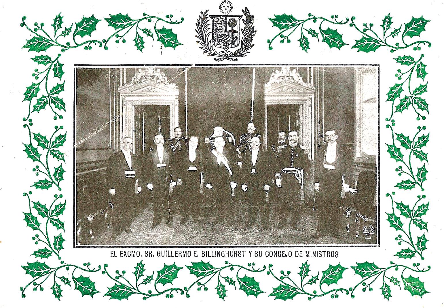 Una postal navideña en el Museo del JNE,del presidente Billinghurstysugabinete,que circuló a fines de 1912, refleja que la navidad no quedaba al margen de los hombres de la política, es una celebración que convoca a todos los cristianos,especialmentealoscatólicos, y que no pasa desapercibida para los no cristianos.