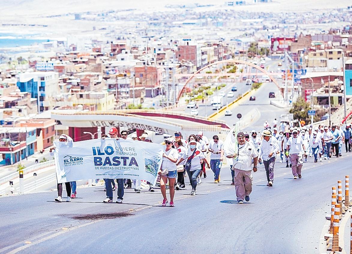 y pancartas se podía leer “Ilo quiere trabajar,basta de huelgasdestructivas”,“Elileñocuidasucasa,noladestruye”,“Ilo te quiero,por eso te defiendo”, “Queremos la Paz y no la violencia”, recorrieron las diferentescallesdelaciudad.
