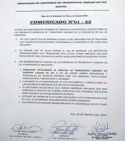 La Asociación de Empresas de Transporte Urbano de Ilo (ADETUI), emitió un comunicadodandoaconoceralosaccionistas y conductores de las diferentes empresas, que ante la manifestación nacional enrechazocontralapresidenta de la República Dina Boluarte programada para hoy jueves 19 de enero, se acordó paralizar totalmente el servicio de transporte urbano en Ilo.