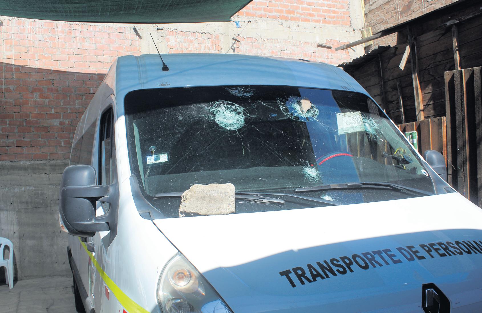 Nuevamente un grupo de los transportistas lanzó piedras,golpearonlapuertadela cochera,ademásrompieronel parabrisas de una unidad y el