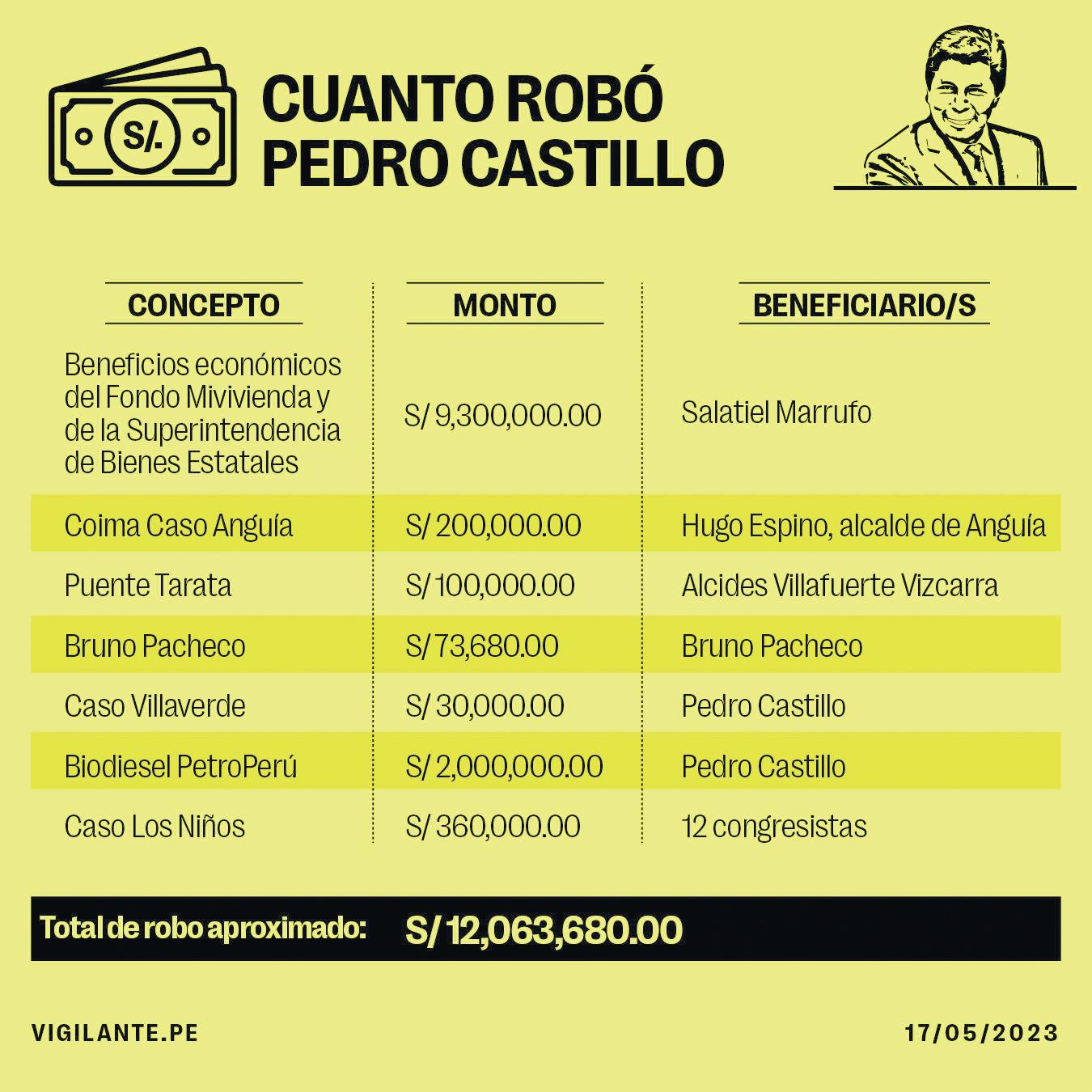 Los más de 12 millones de soles que robó Pedro Castillo hubieran sido suficiente para financiar el presupuesto regional de desastres naturales para el norte del Perú, así como para la implementación y construccióndemilesdecolegiosyhospitalesanivelnacional. Toca recordar que, como contribuyentes, somos quienes financiamos las obras públicas dentro del país, por lo que tenemos el deber de exigir a las autoridades que este dinero realmente sea invertido en beneficio de la ciudadanía,mas no en las coimas que únicamente favorecen a gobernantes corruptos. [Fuente: Vigilante.pe]