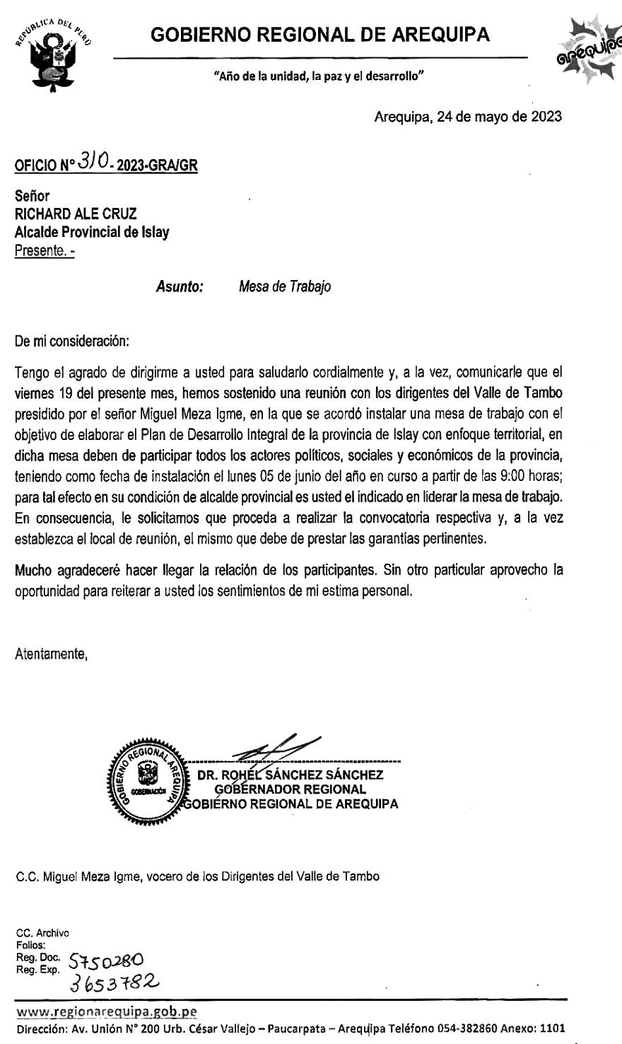 En medio de la incertidumbre ycontroversiaquevienegenerando la anunciada visita del gobernador regional de Arequipa,RohelSánchez,alaprovincia de Islay para la instalación de una mesa de trabajo elpróximo5dejunio,dichaautoridad envió el Oficio N° 3102023-GRA/GR al alcalde provincial de Islay,Richard Ale,pidiéndole que lidera la mesa y sea quien convoque a los participantesparadichoevento.