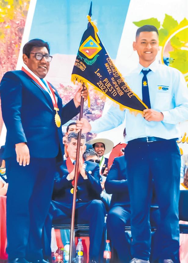 Ÿ Desfilaron con civismo y compromisoconunadelegacióndejóvenesapaso firme y marcial, producto de ello obtuvo el primerlugar,lograndoelGallardete,quefueentregadode manosdelalcaldeSantosVillegasMamani.