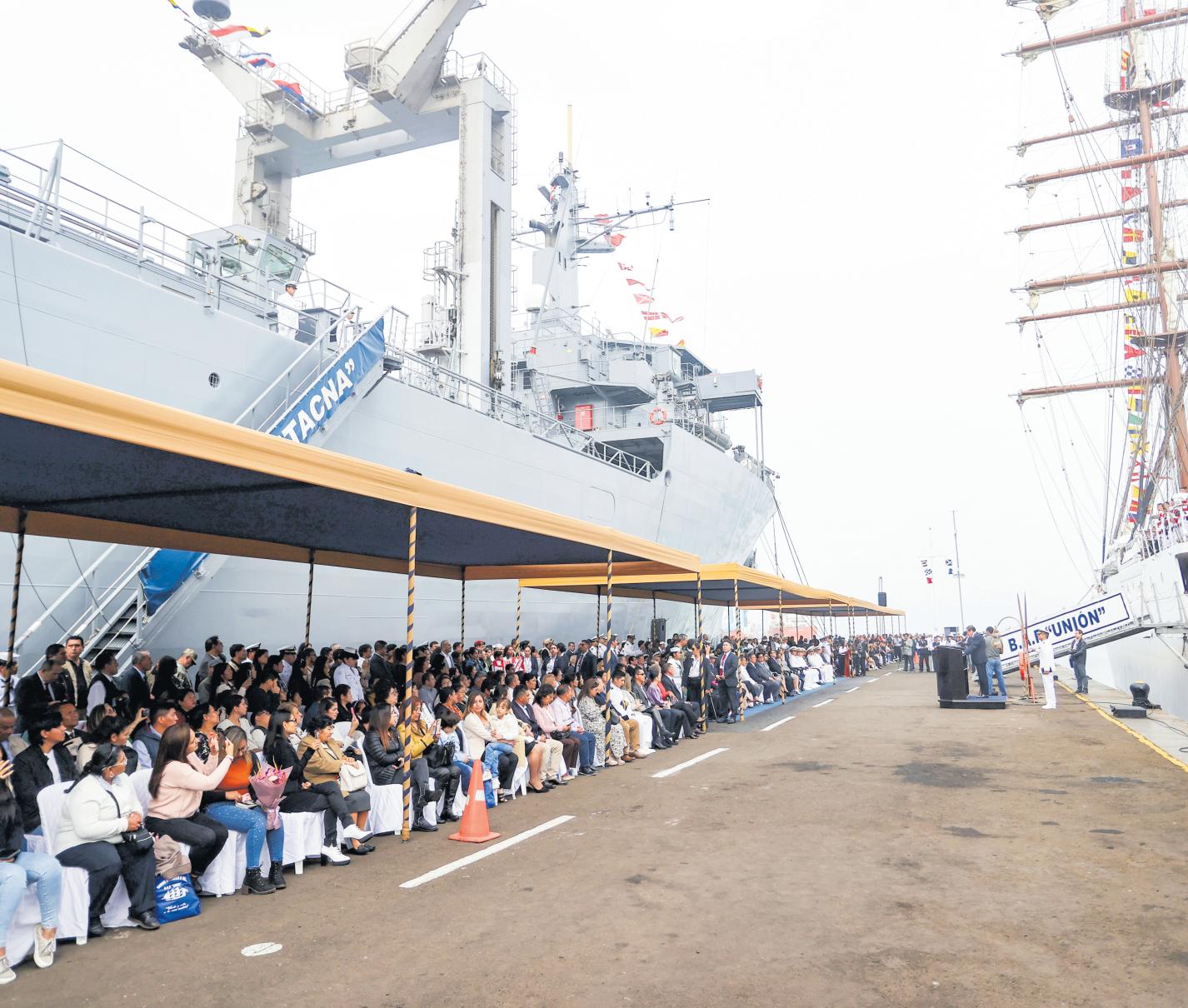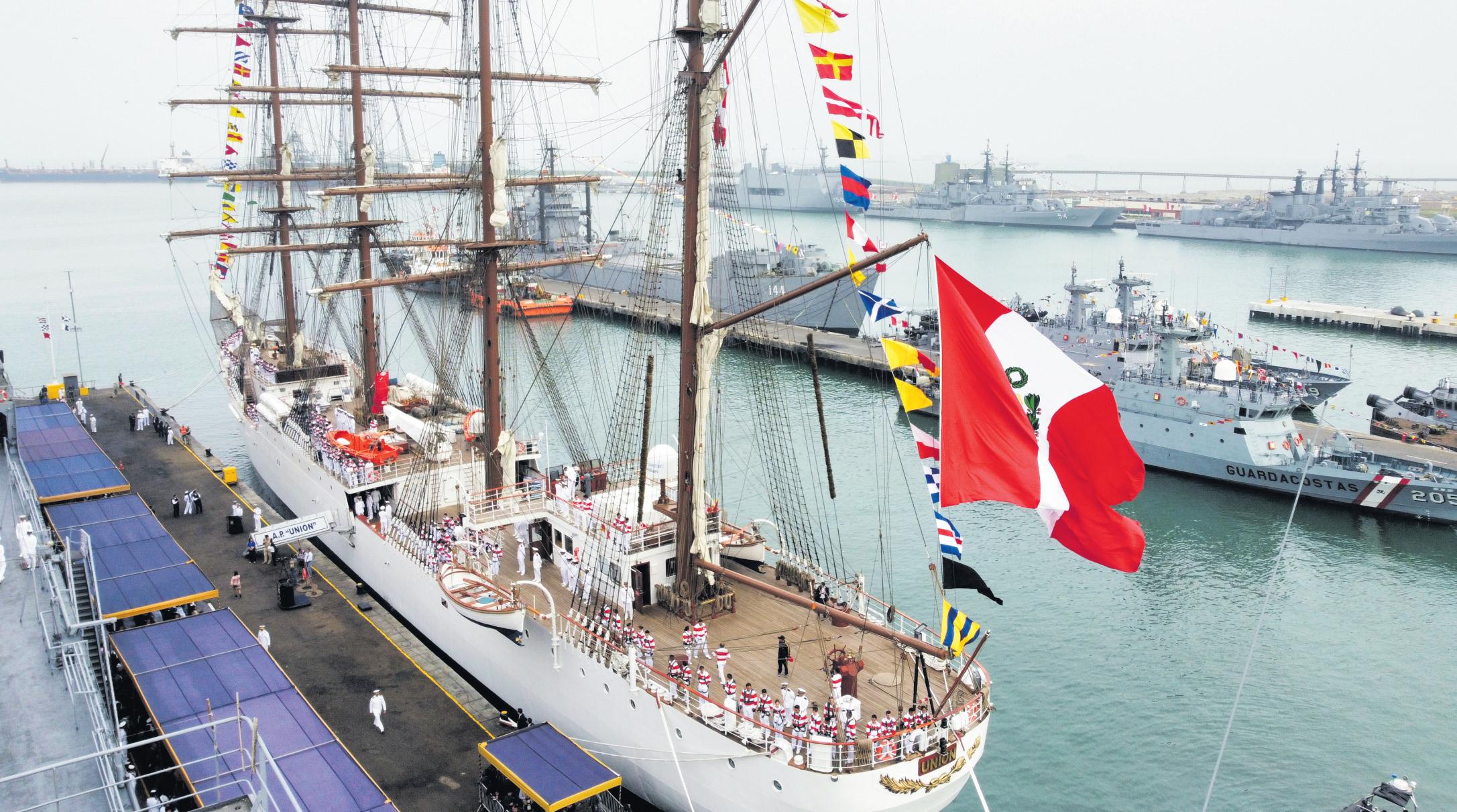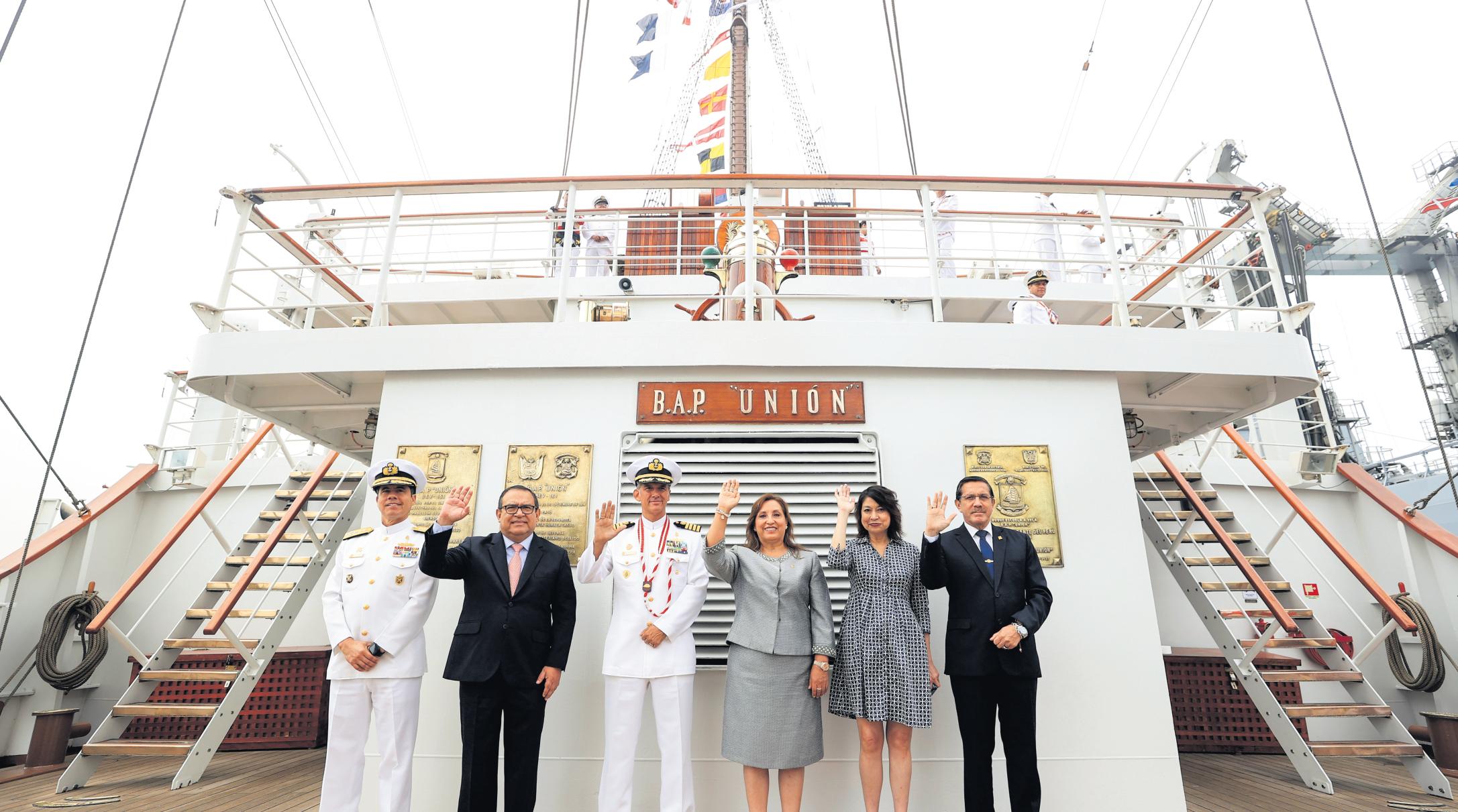 La Mandataria Dina Boluarte lideró la ceremonia de zarpe del buque escuela a vela BAP Unión, que inicia una travesía por 16 países, en cinco continentes,contripulantesycadetesdelaMarinadeGuerra.