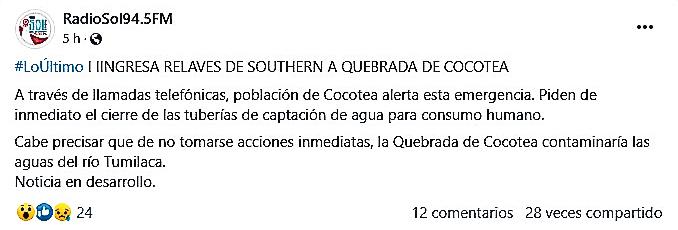 Finalmente,elbiólogo Carlos Santos manifestó que el agua que discurre por la quebrada Cocotea es agua fresca delreservoriodeViñaBlancay que no hay ningún riesgo de contaminación por relaves, ya quelaconcentradoraCuajone se encuentra en parada por mantenimiento.