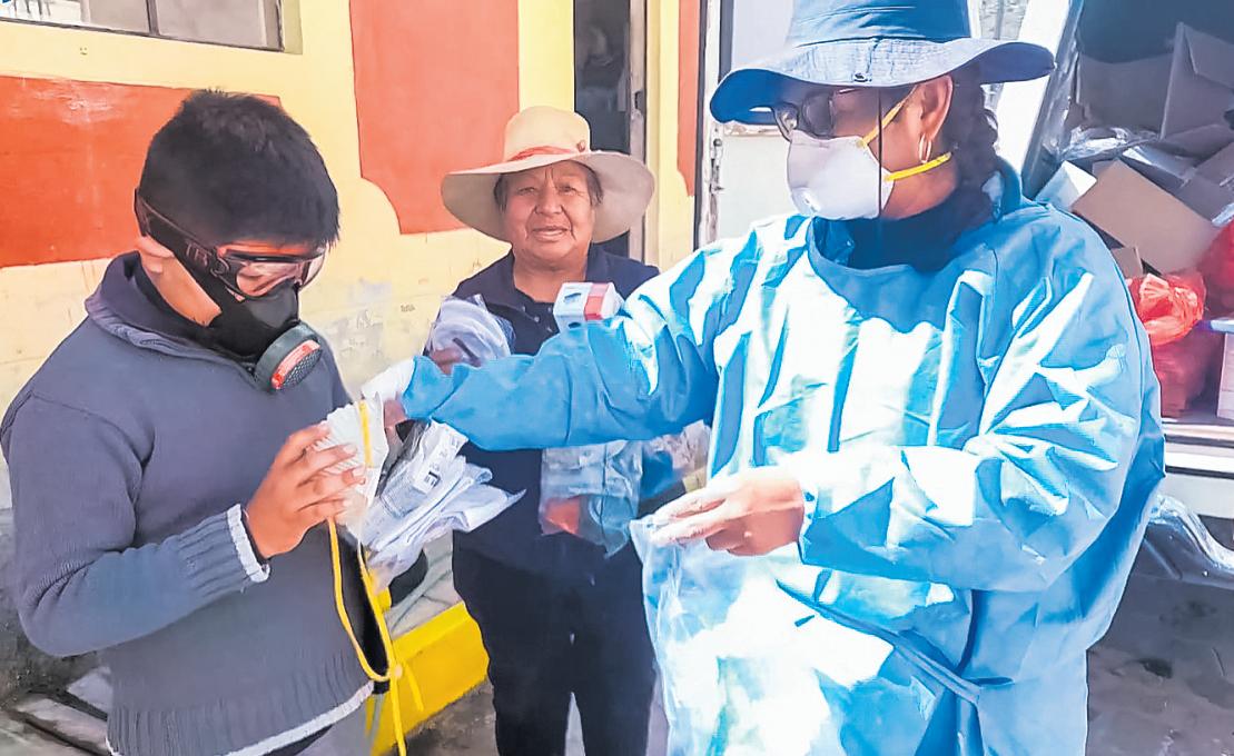 Personal de la Dirección RegionaldeSaludllegaronaldistritode Ubinasyentregarona la población mascarillas, lentes, entre otros implementos para que se puedan proteger delacenizavolcánica.