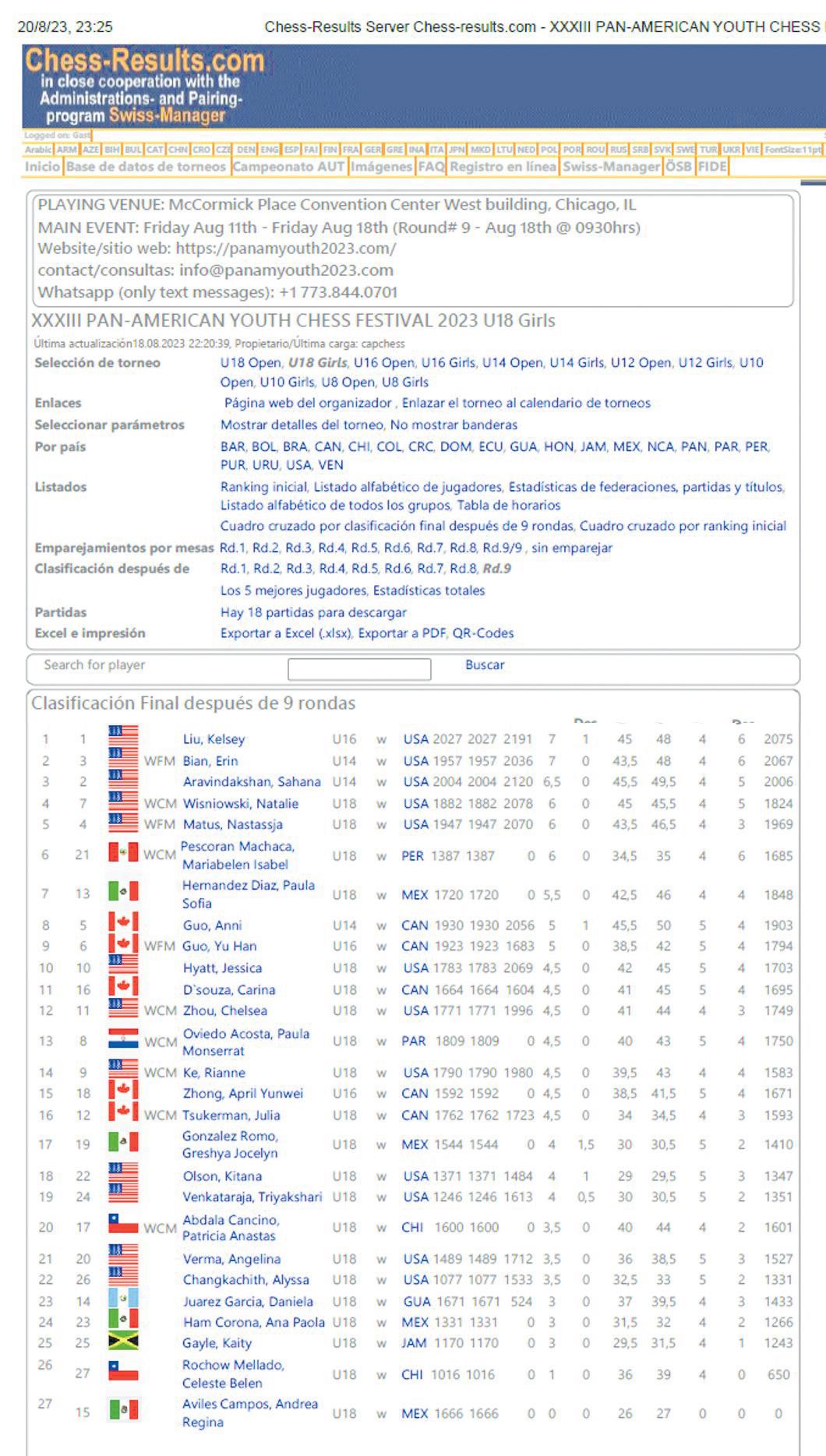 en el Campeonato PanamericanoJuvenildeajedrez2023. Según publicó, la destacada ajedrecista ileña,en sus redes sociales, en el ritmo clásico de 9 rondas (90min +