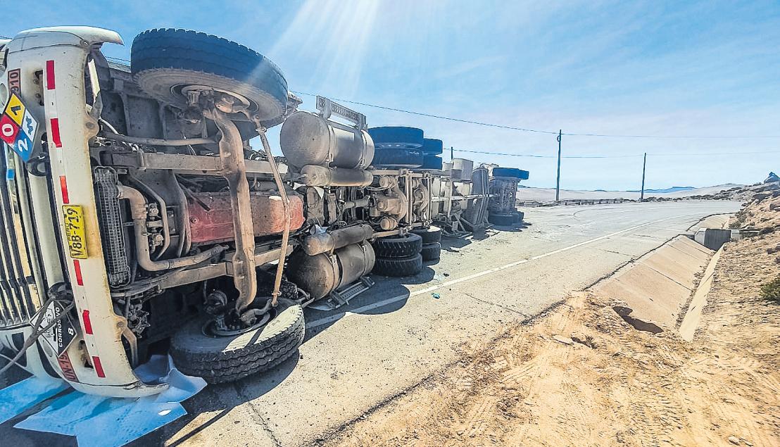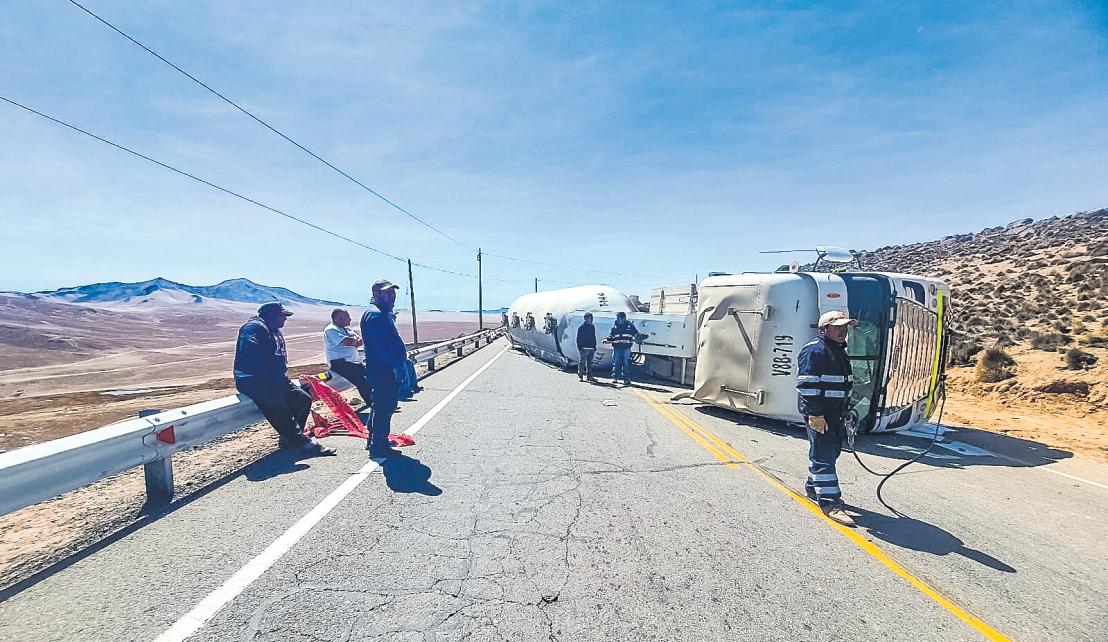 Un vehículo con bombona de calvolcóenelKm108+800de la carreta binacional jurisdicción del distrito de Torata,dejando como saldo daños materiales.