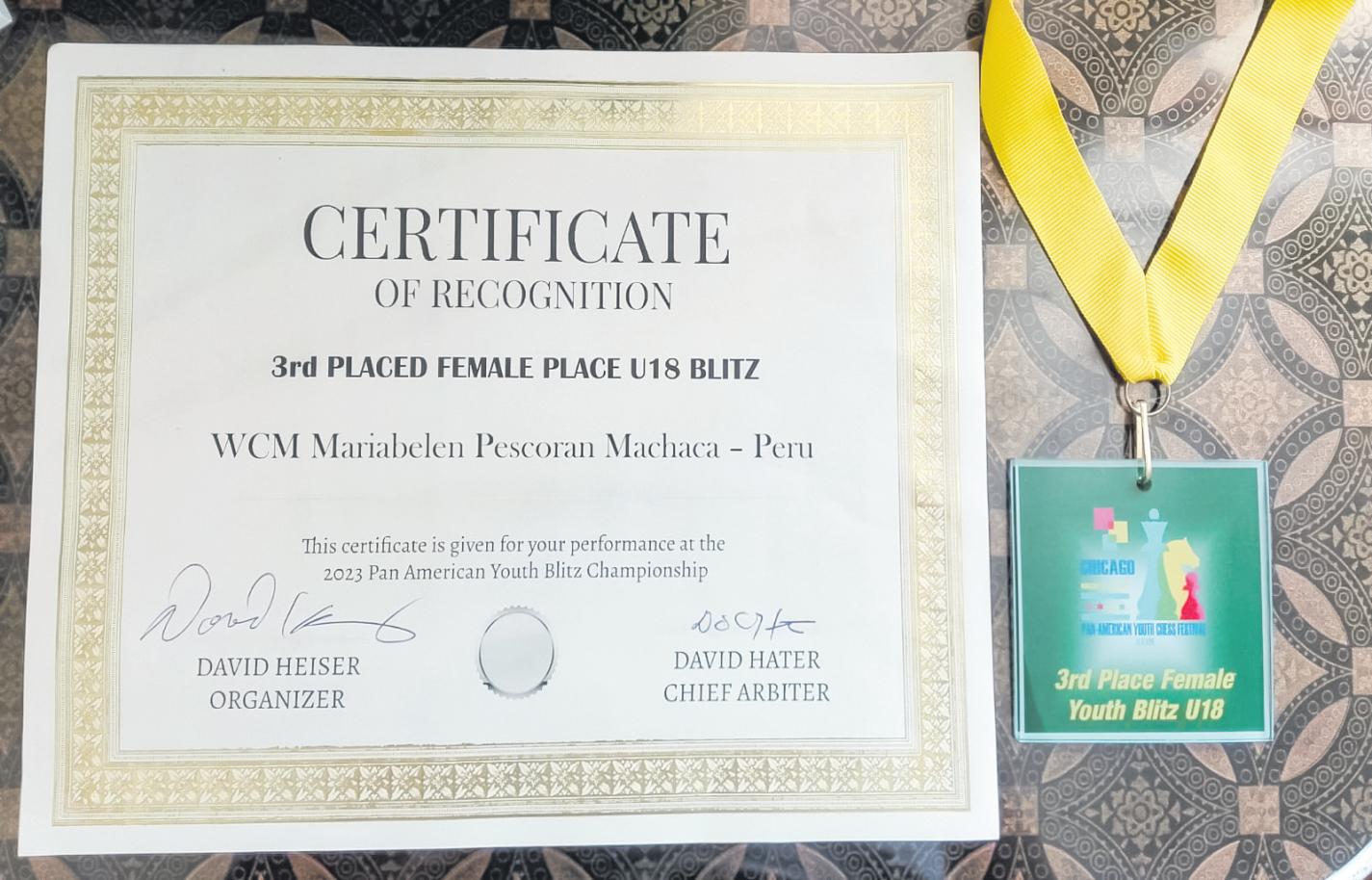 Mientras que en el ritmo Blitz, también de 9 rondas (3min + 2seg de incremento porjugada)compitióporcategoría abierta (hombres y mujeres), al momento de premiar,Mariabelenquedóentercer puesto a nivel Panamericano.