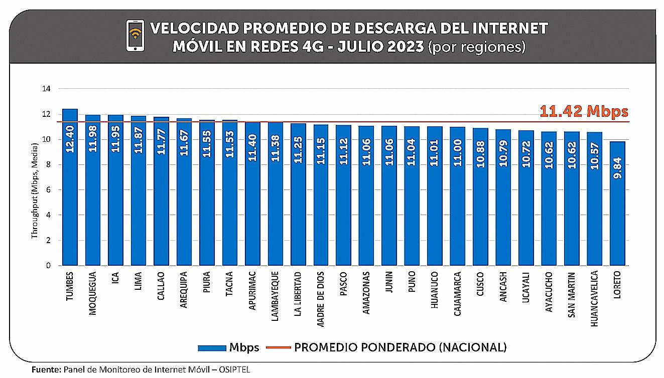 Según la información recopilada en el Panel de Monitoreo del Internet Móvil del OrganismoSupervisordeInversión Privada en Telecomunicaciones (OSIPTEL), Moquegua fue la segunda región con mejor desempeño de velocidad de descarga (bajada) en el servicio de internet móvil en redes 4G, alcanzando un promedio de11.98Mbps(megabitporsegundo) en el mes de julio del presenteaño.