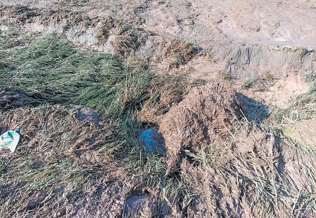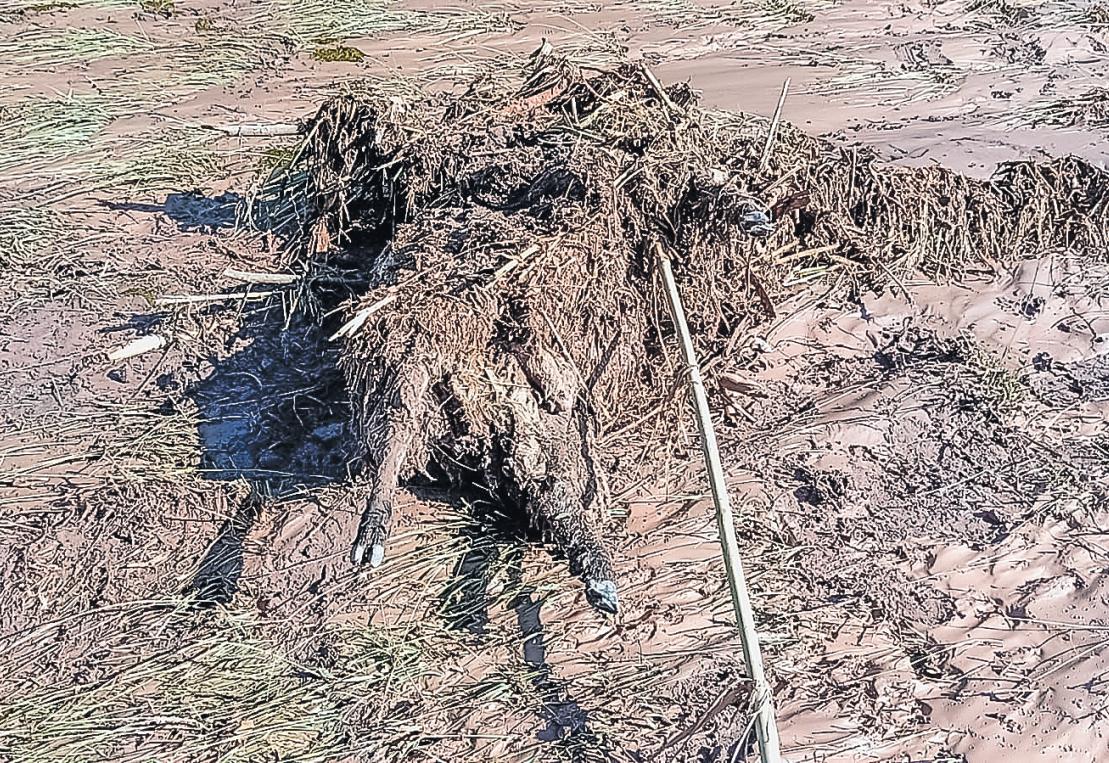 Duranteel recorridopor algunaschacras, sepudoobservar carnerosy becerros enterradosporel lodo,arbustosy palos.Además, varioscultivos quedaron destruidos.
