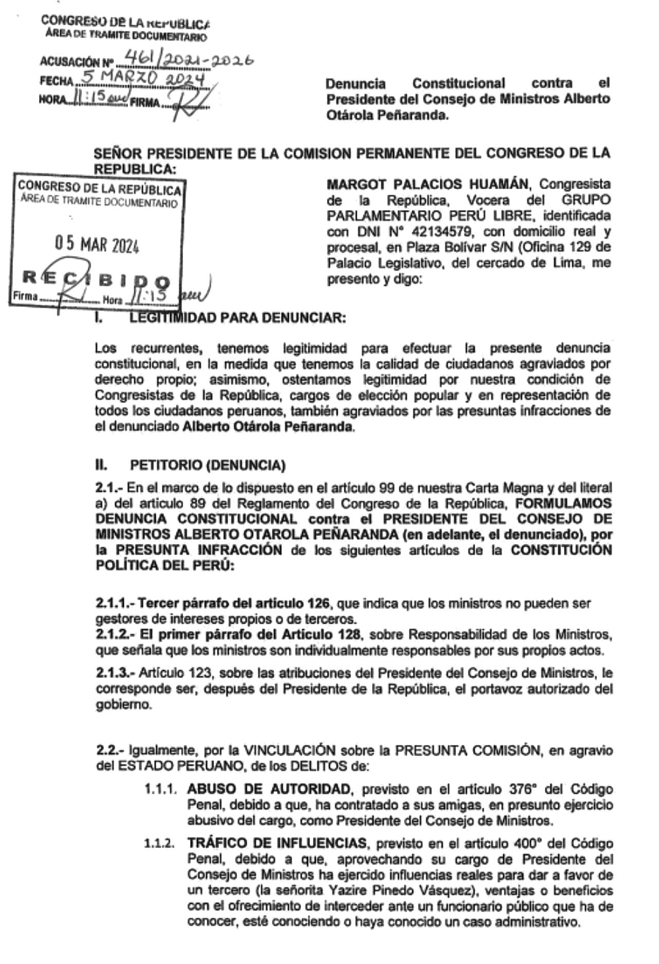 bre,Margot Palacios,presentó una solicitud similar, alegando que el jefe del gabinete no solo habría violado la Constitución,sinotambiénhabríaincurrido en delitos de abuso de autoridad y tráfico de influencias.
