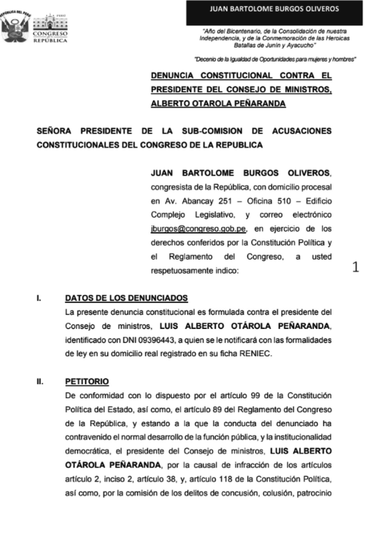 Asimismo, el legislador Juan Burgos, perteneciente a la bancada de Unidad y Diálogo Parlamentario, interpuso unanuevadenunciaconstitucionalencontradeOtárola.