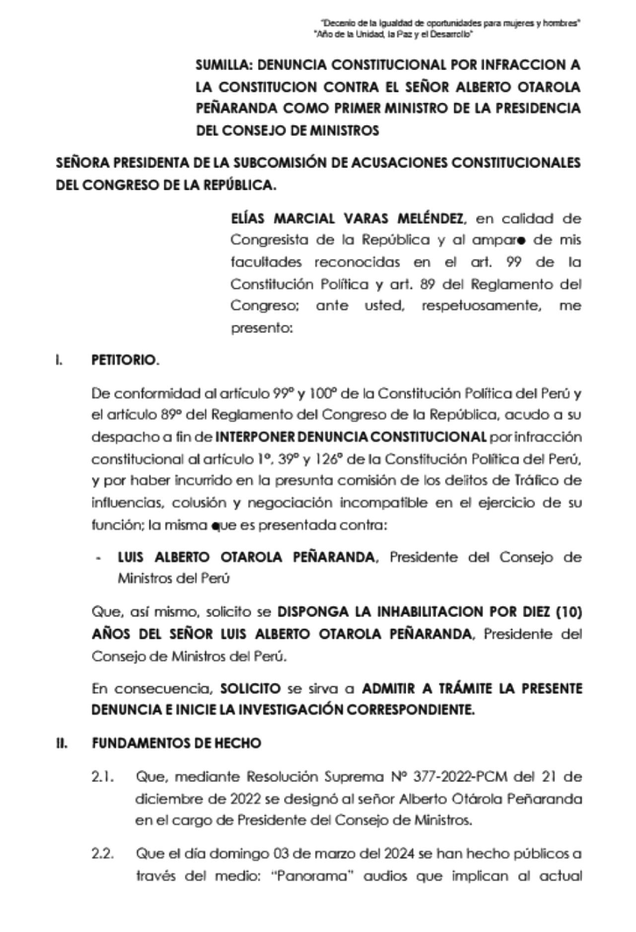 Similar a la denuncia del congresista Varas, esta alega que Otárola habría actuado de manera indebida, argumentando que “los ministros no pueden ser gestores de intereses”.
