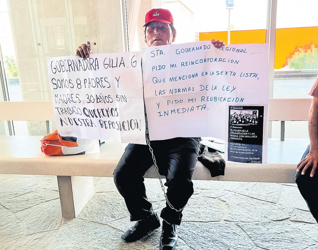 Con pancartas que llevaban mensajes como "Gobernadora Gilia,somos 8 padres y madres,30 años sin trabajo.Queremos nuestra reposición", ex trabajadores del Gobierno Regional de Moquegua se encadenaronenelinteriordelasedeinstitucional.