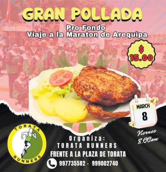 Ellos integran la Academia Torata Runners, pero como allí no existe un fondo de apoyo al deporte,por eso desde las 8:00 horasdelviernesenlaplazaofreceránunapolladaconlafinalidad de pagar su inscripción de participación, además del viaje a la CiudadBlanca,alojamientoyalimentación. Ojalá que algún regidor del municipio,antes que los revoquen,toma la iniciativadecrearunfondodeapoyo al deporte, ya que no es posible que la juventud torateña tenga que hacer polladas para viajar a correr llevando los colores de Torata. Y cuando vuelven triunfantes, ahí sí, se suman para reconocerlos …EN LOS TRINQUETES POLÍTICOS, TODO SE SABE.