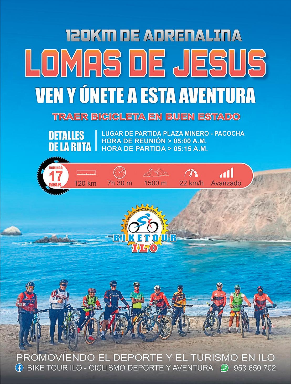 Los entusiastas ciclistas organizadosdelaciudaddeIlo continúan manteniendo una activa participación, especialmente los domingos,al cubrir rutasendiversosparajesdela provincia. Con el objetivo principal de fomentar el deporte y mantenerse saludables, estos grupos también promocionan áreas turísticas que muchos desconocen.