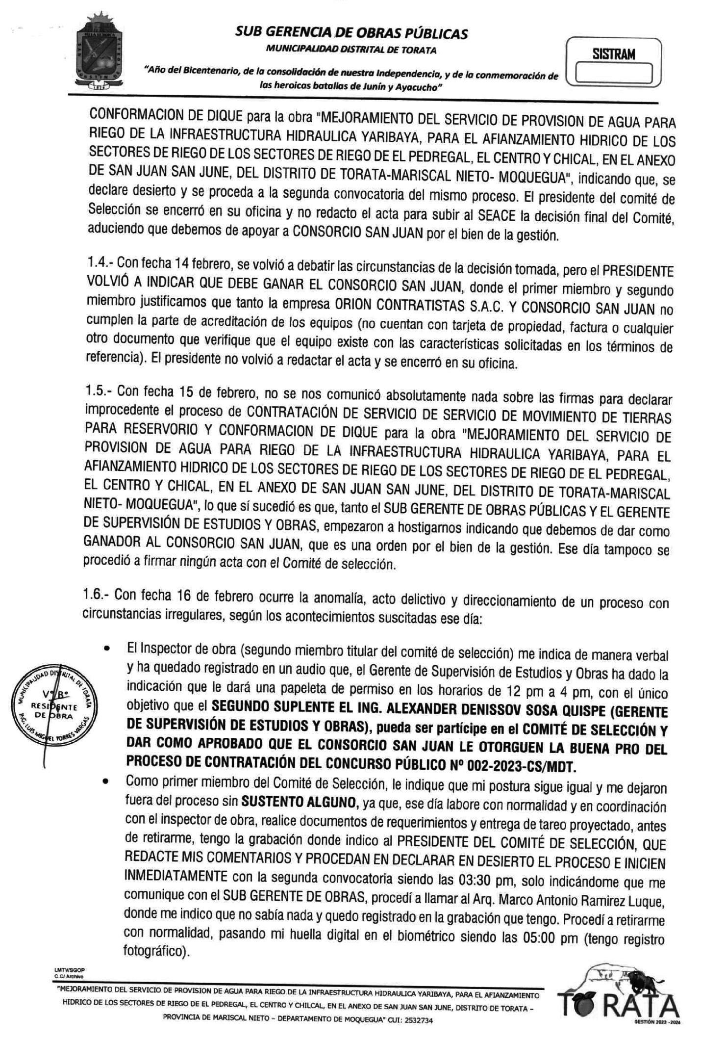 El residente de obra Ing. LuisMiguelTorresVargasconcluye que hubo favoritismo y/o direccionamiento al Consorcio San Juan, considerado un delito penado, por lo que