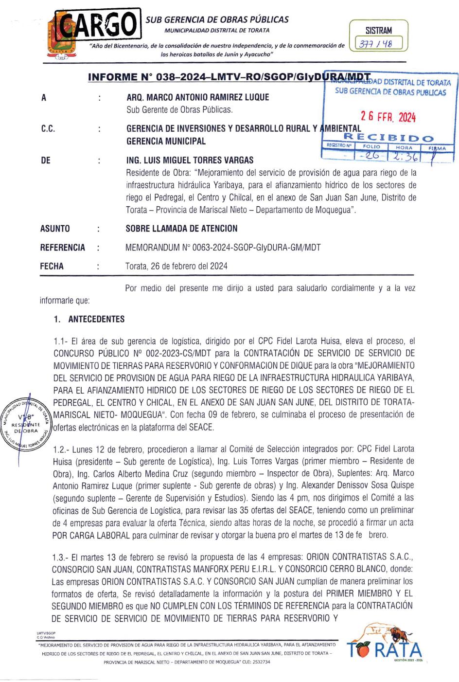 no será parte ni estará confabulado con dicho proceso de selección y menos que le hayan colocado el memorándum; refiriéndose al Memorándum Nro. 0063-2024SGOP-GLYDURA-GM/MDT de llamada de atención por hacer caso omiso a una indicación que debía seguir con el asistente del sub gerente de ObrasPúblicas.