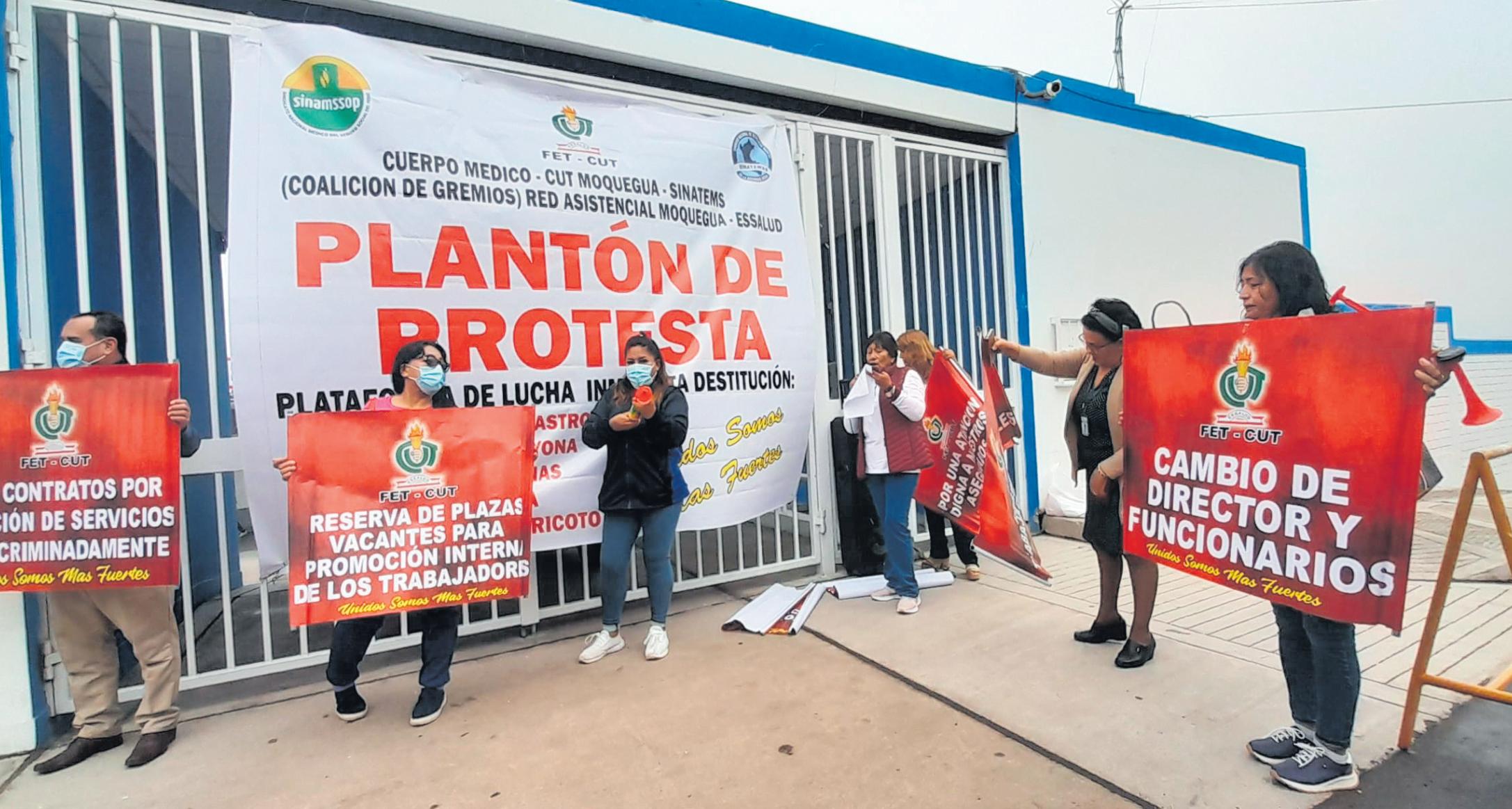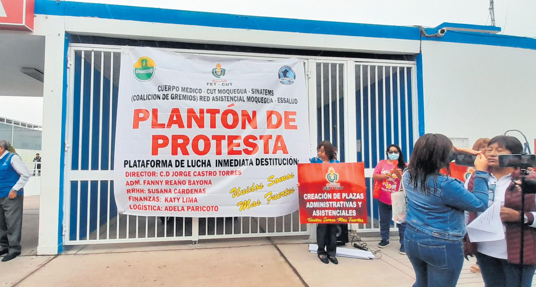 La mañana de este último lunes,un grupo de trabajadores de EsSalud realizó un plantón en el frontis del Hospital II de EsSalud, exigiendo el cambio del director de la Red AsistencialMoquegua,JorgeLuisCastroTorres,quienasumióelcar-