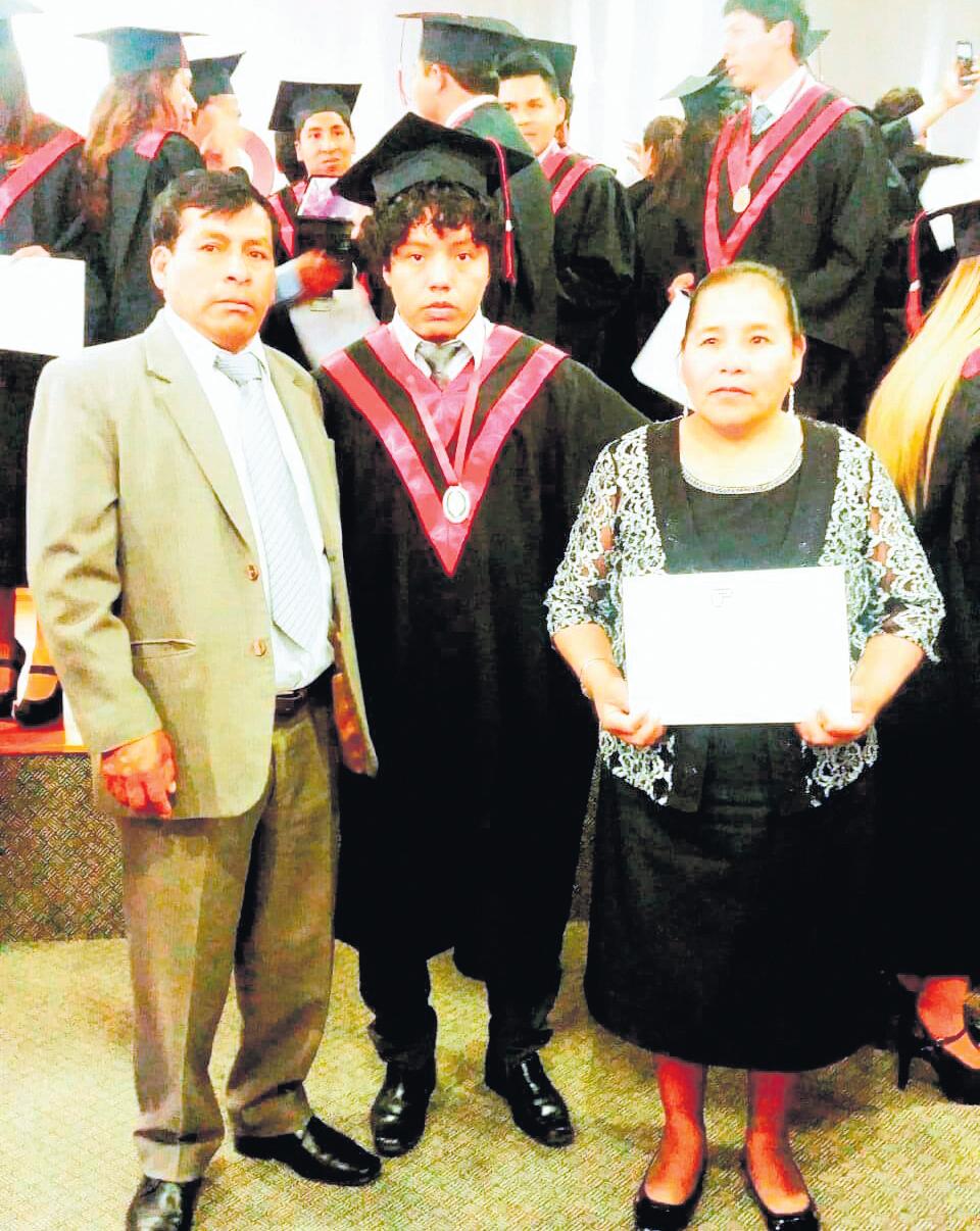 | Luis Sanca Umiyauri y sus padres Luis Sanca Coaquira yAngelica Umiyauri Ccasa,en su graduación. |