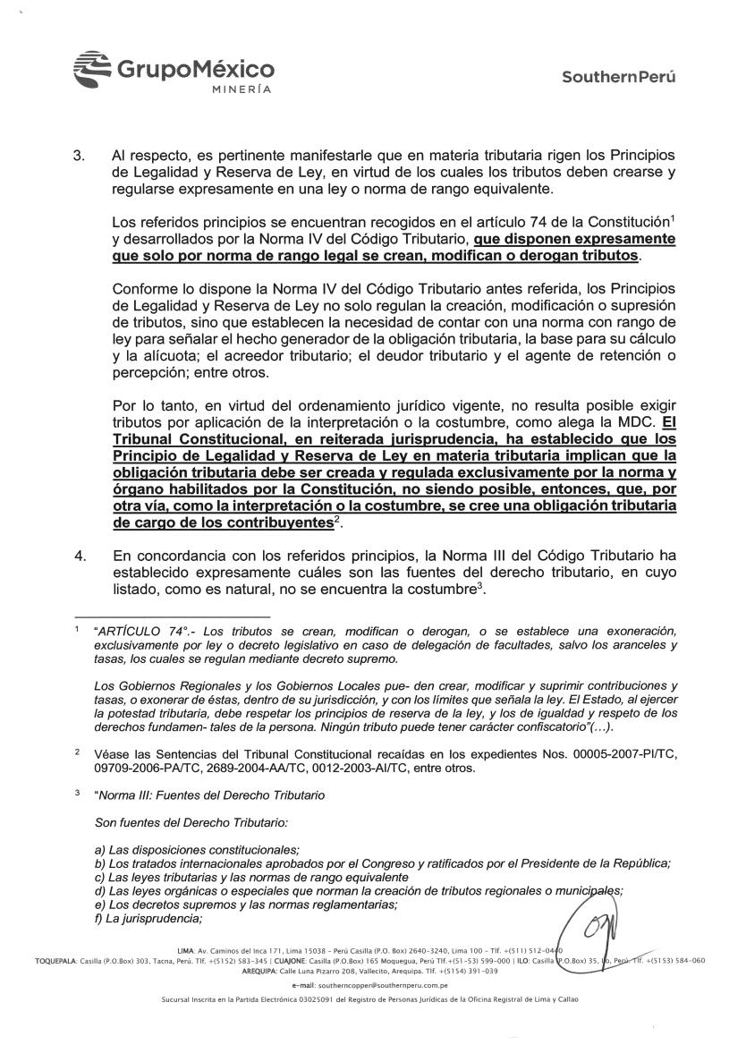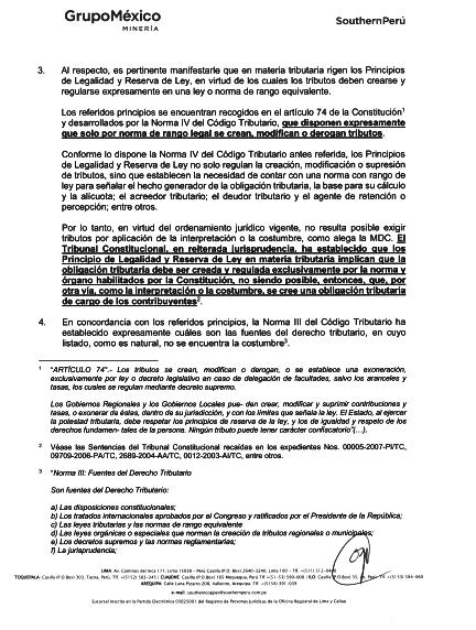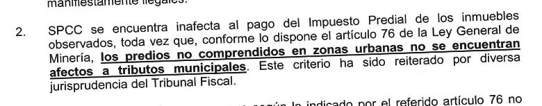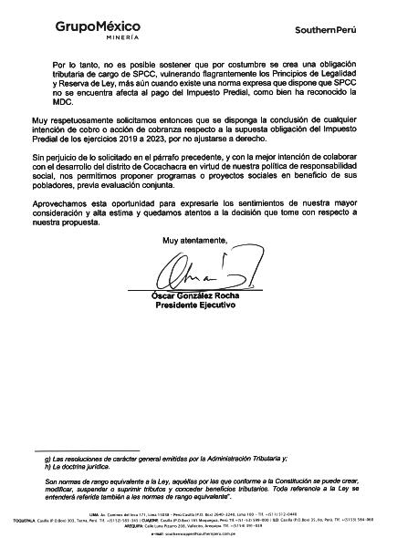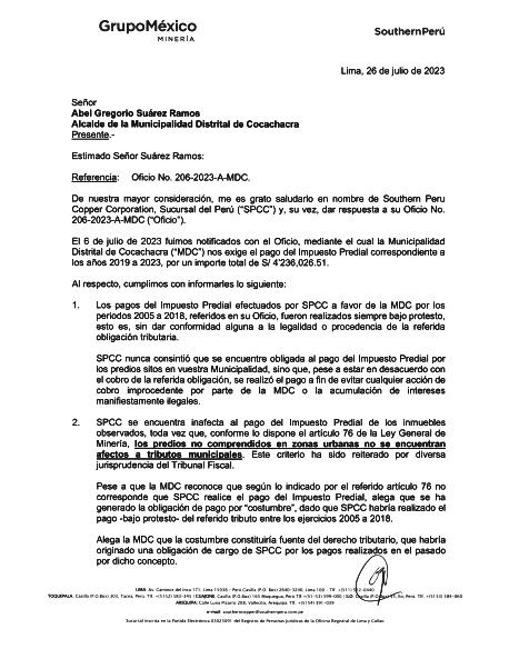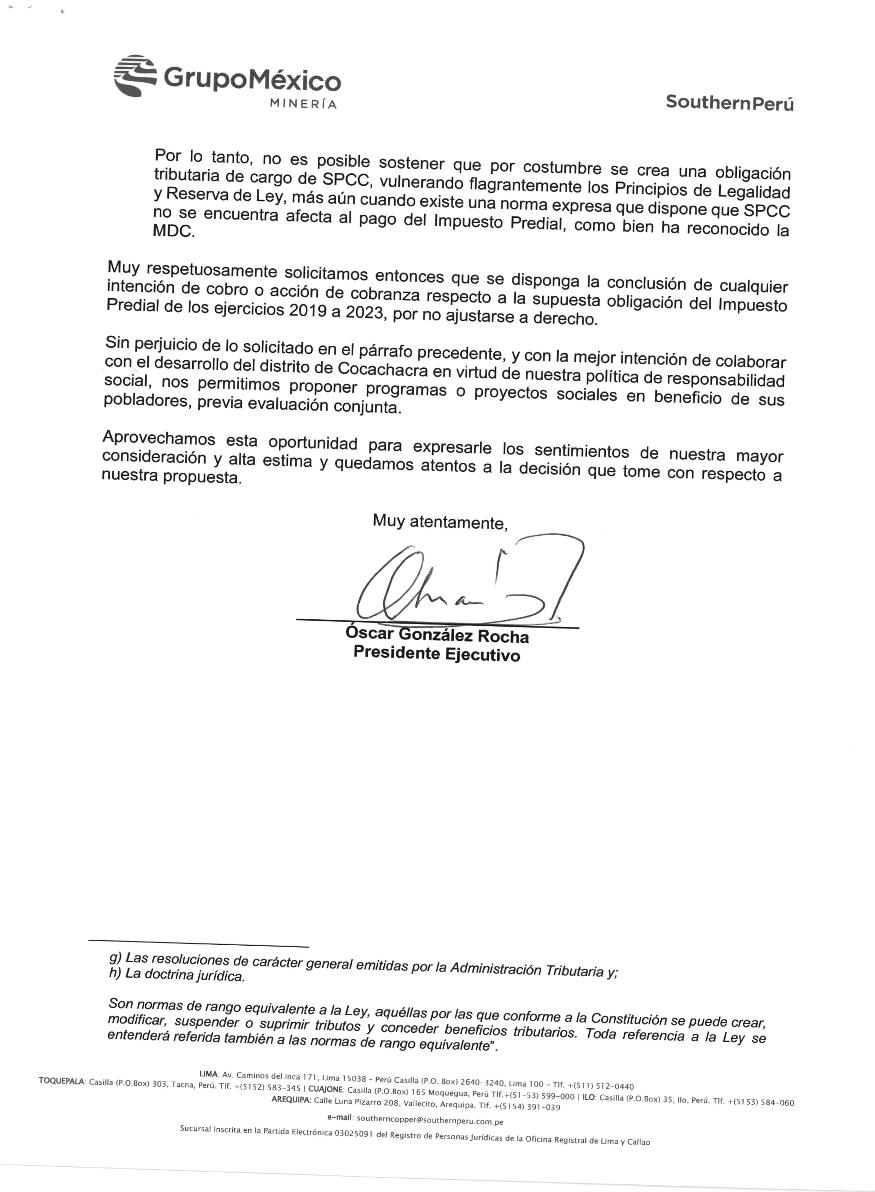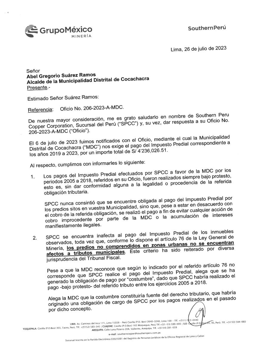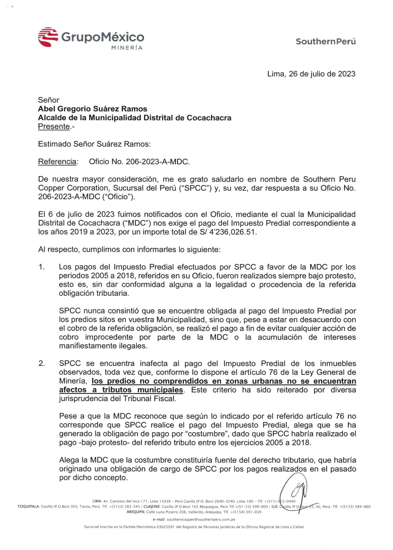 ISLAY AL MUNICIPIO DE COCACHACRA Southern aclara sobre pago de tributos