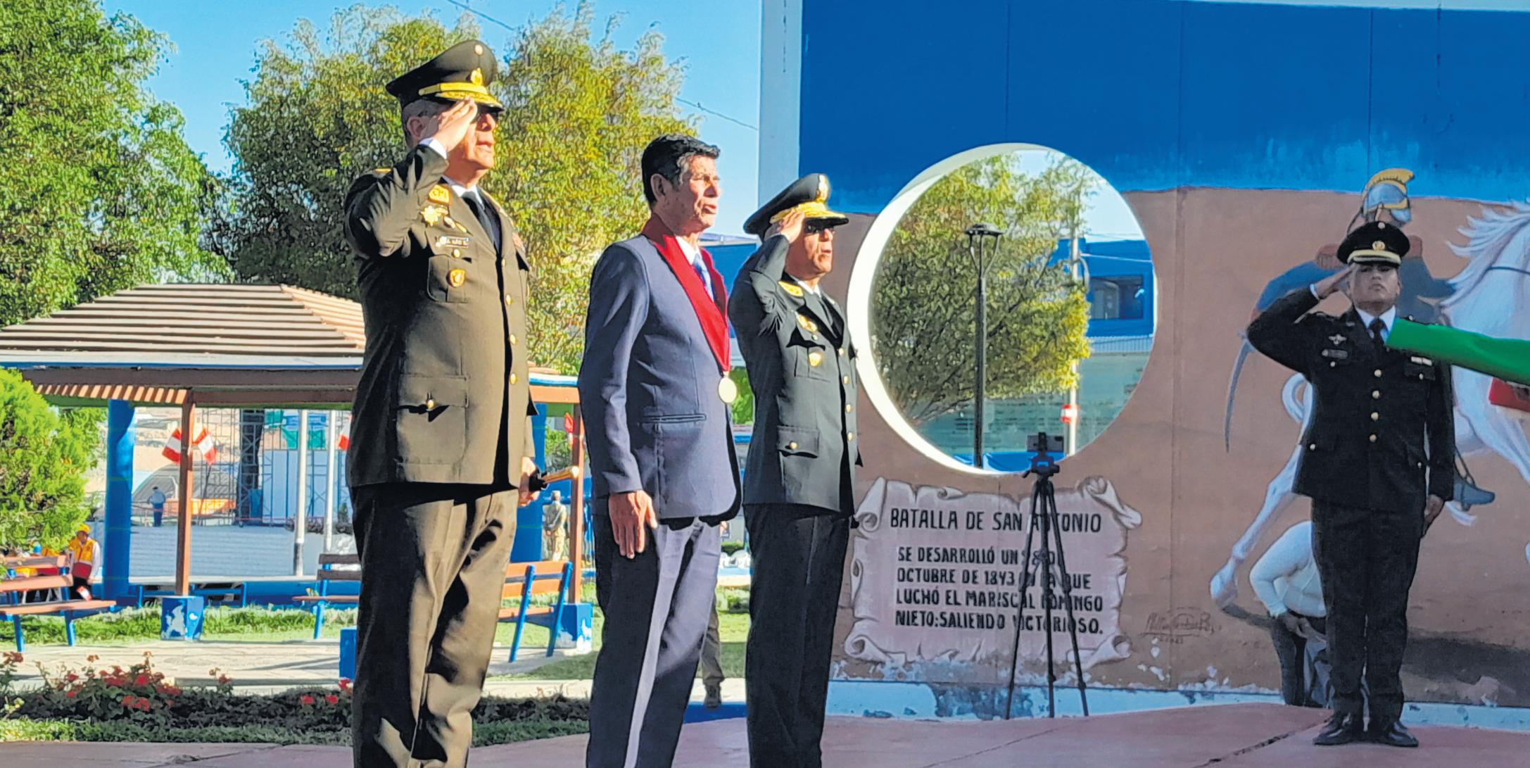 Abelardo CerveraVeliz,acompañado del general EP Julio Mori Rabanal y el general Oscar RodríguezValles,jefede la Región Policial de Moquegua. También se presentaron arreglos florales al monumento de Francisco Bolognesi.