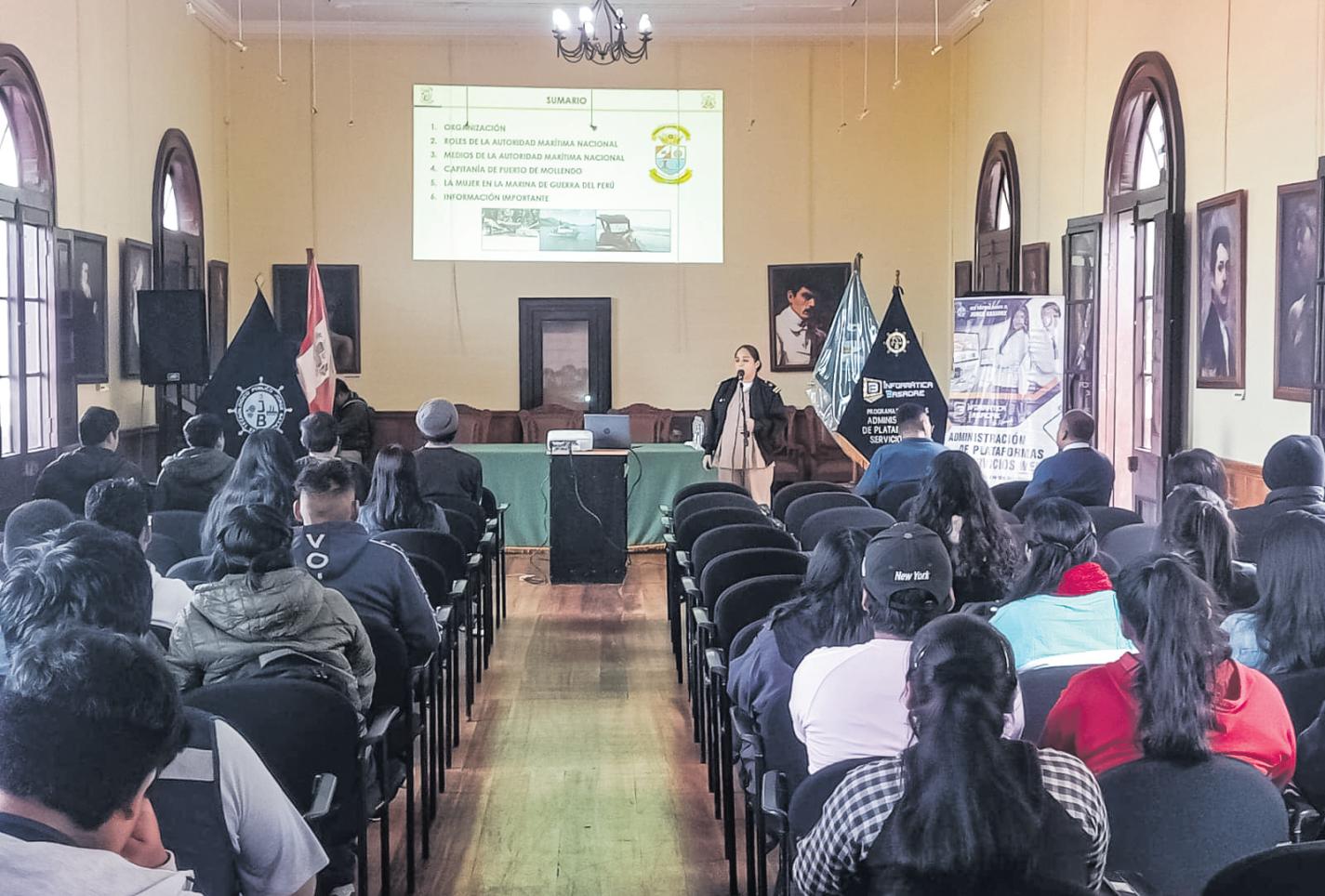 LaCapitaníadePuertodeMollendo realizó en la Estación Cultural, una charla de concienciamarítimadirigidaalos estudiantes del Instituto de Educación Superior Pedagógico Público Jorge Basadre de Mollendo donde participaron 65estudiantes. Eltemafue:laimportancia delpapeldesempeñadoporla Marina de Guerra del Perú, a través de la Dirección General