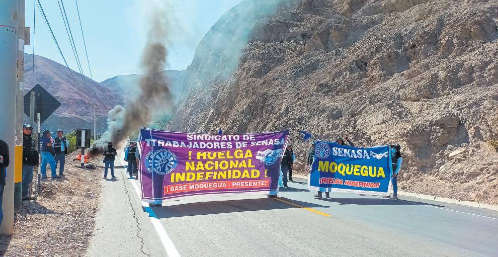 Ensucuartodíadehuelganacional indefinida, los trabajadores del Servicio Nacional de SanidadAgraria(SENASA)bloquearon la carretera Binacional a la altura del ex peaje,en Samegua.