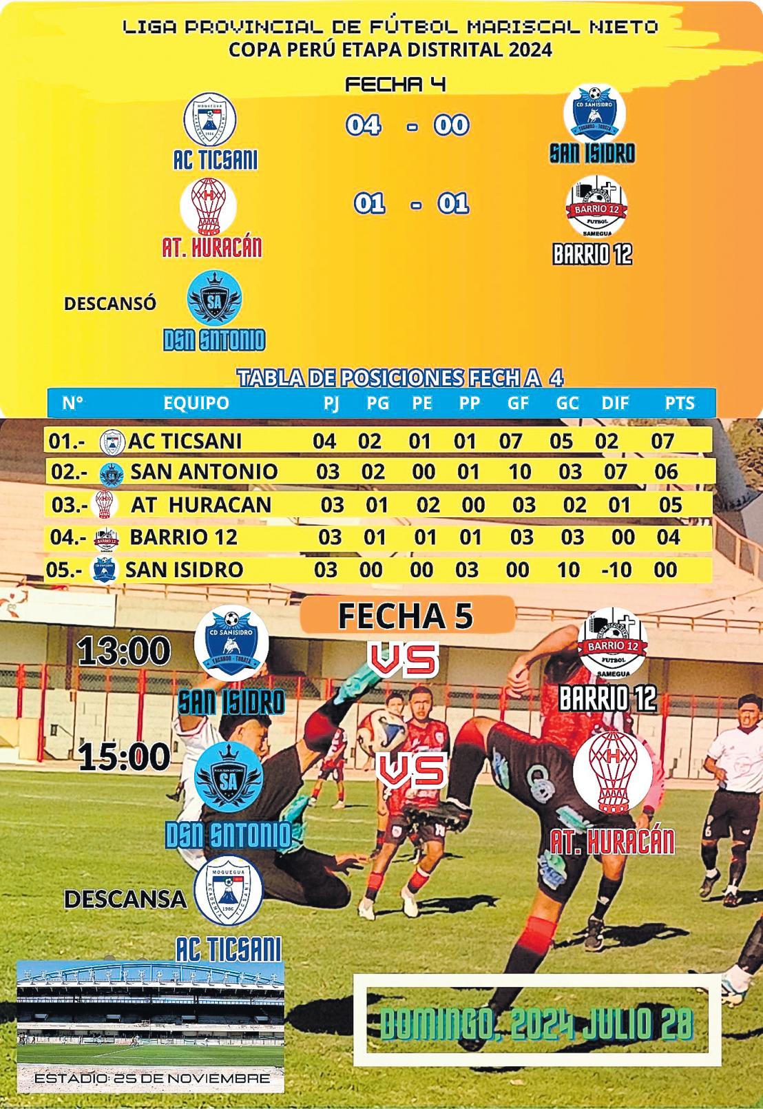 A una fecha para finalizar la Copa Perú Provincial en Mariscal Nieto, Ticsani lidera la tabla tras apabullar a San Isidro 4-0 en la provincial moqueguana. Este domingo descansan.