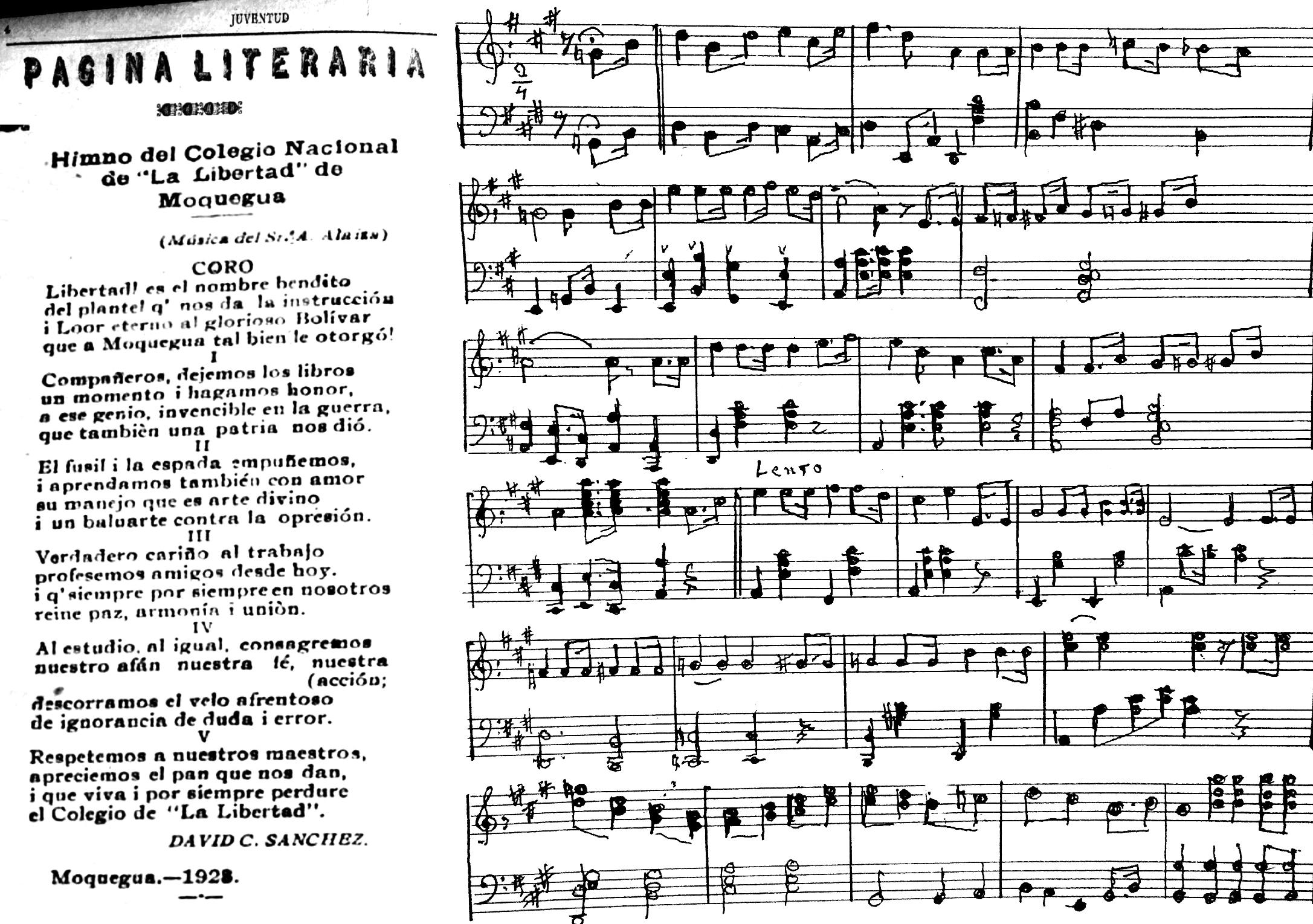| Himno al Colegio.Música AmaroAlayza,letra David Cornelio Sánchez [Archivo GustavoValcárcel Salas] |