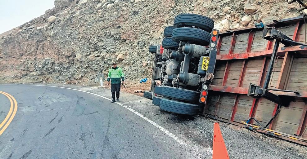 La pesada unidad vehicular fue encontrada recostada sobre uno de los lados fuera delavía,endirecciónsuranorte Según el conductor, cuando se trasladaba de Tacna a Arequipa, un camión de color