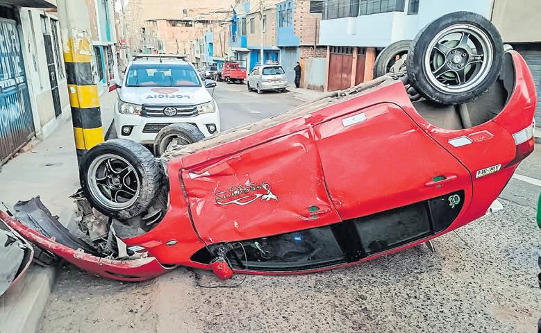 “Security”yconducidopor Karina Mamani Luque, resultó volcado con los neumáticos hacia arriba debido a la violencia del choque. El vehículo sufrió daños materiales significativos en la parte delantera,